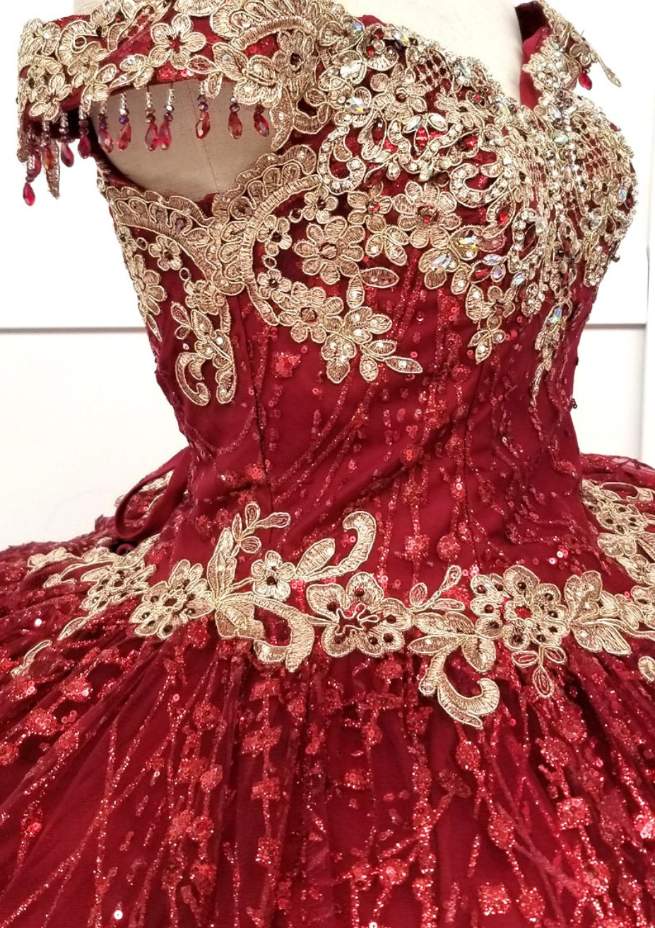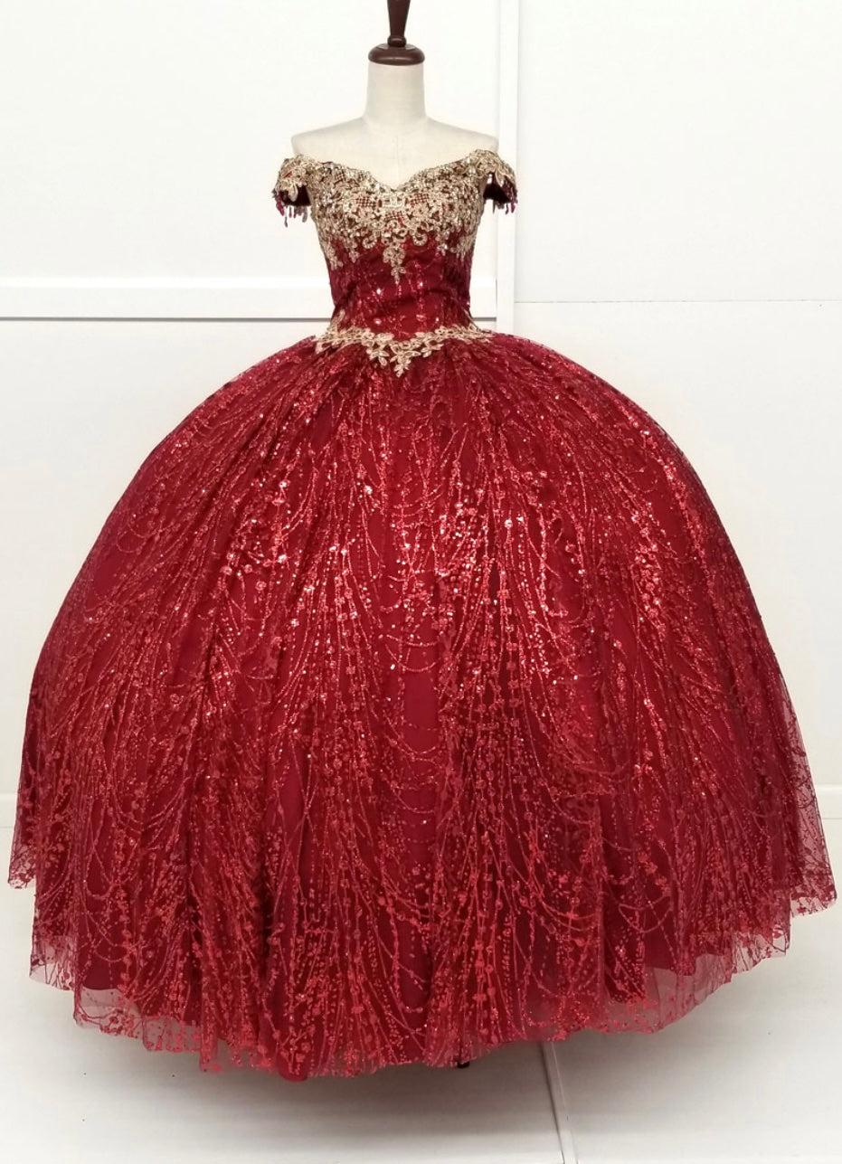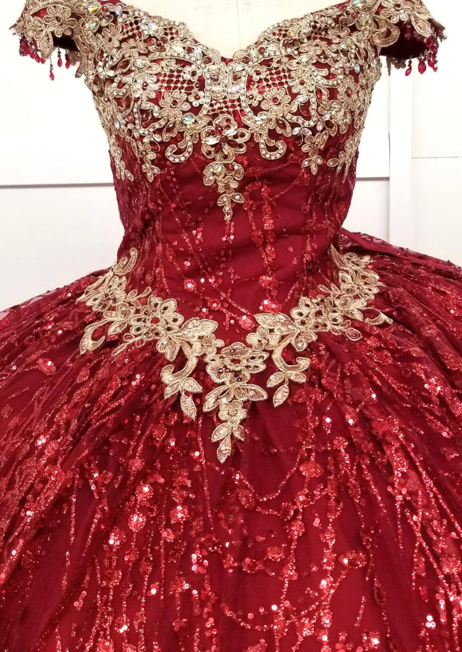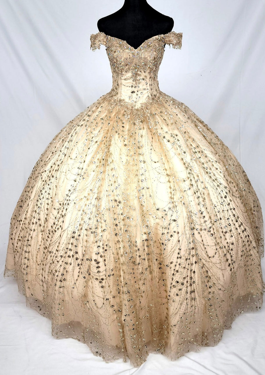 Step into a fairytale with this luxurious ball gown by Chicas, style CHF3011. This regal off-the-shoulder dress features an intricately beaded bodice with dazzling gold embroidery and a sweetheart neckline. The voluminous skirt is adorned with glittering sequin patterns cascading in elegant drapes, adding depth and movement to every step. A perfectly cinched waistline enhances the silhouette, while the dramatic full skirt creates a show-stopping look. Available in stunning shades of burgundy, champagne, green, and rose gold, this gown is ideal for quinceañeras, galas, or any grand celebration.
