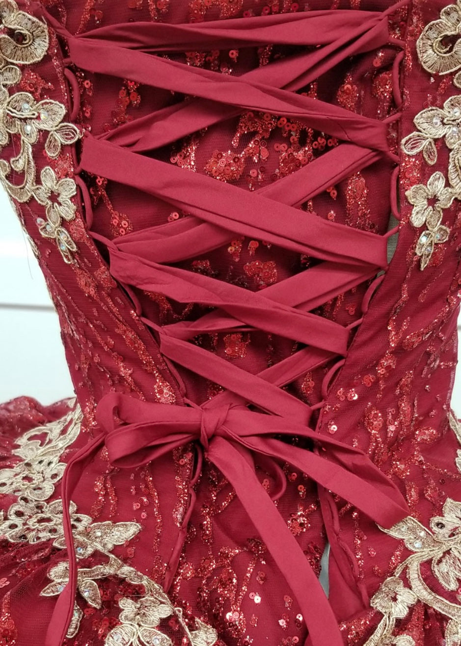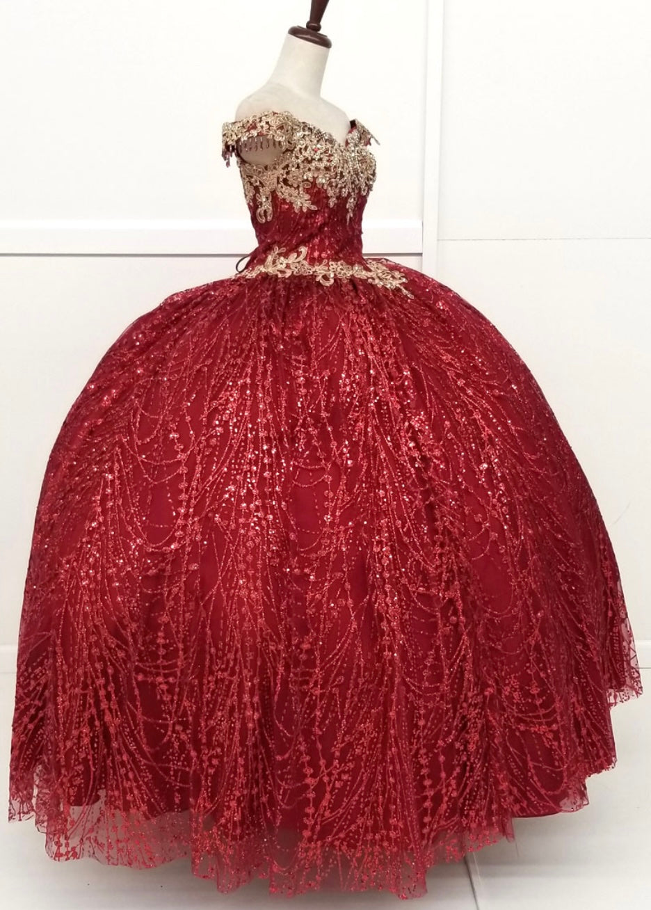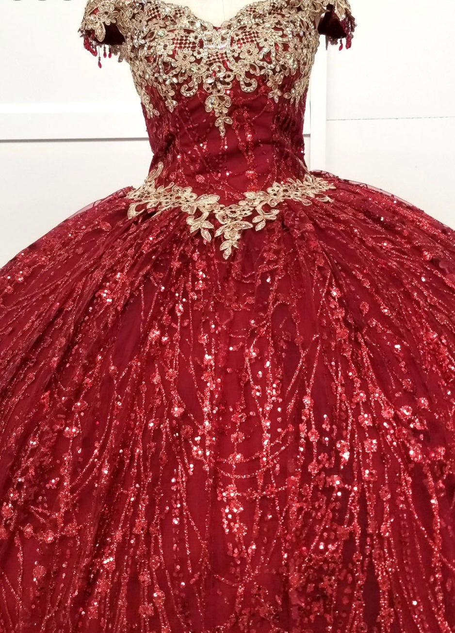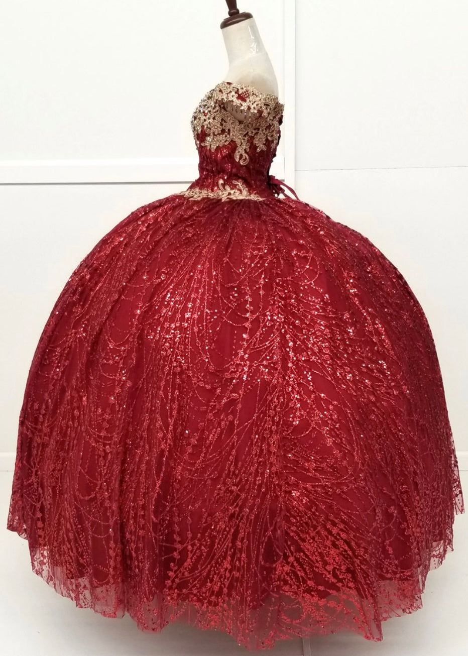Step into a fairytale with this luxurious ball gown by Chicas, style CHF3011. This regal off-the-shoulder dress features an intricately beaded bodice with dazzling gold embroidery and a sweetheart neckline. The voluminous skirt is adorned with glittering sequin patterns cascading in elegant drapes, adding depth and movement to every step. A perfectly cinched waistline enhances the silhouette, while the dramatic full skirt creates a show-stopping look. Available in stunning shades of burgundy, champagne, green, and rose gold, this gown is ideal for quinceañeras, galas, or any grand celebration.