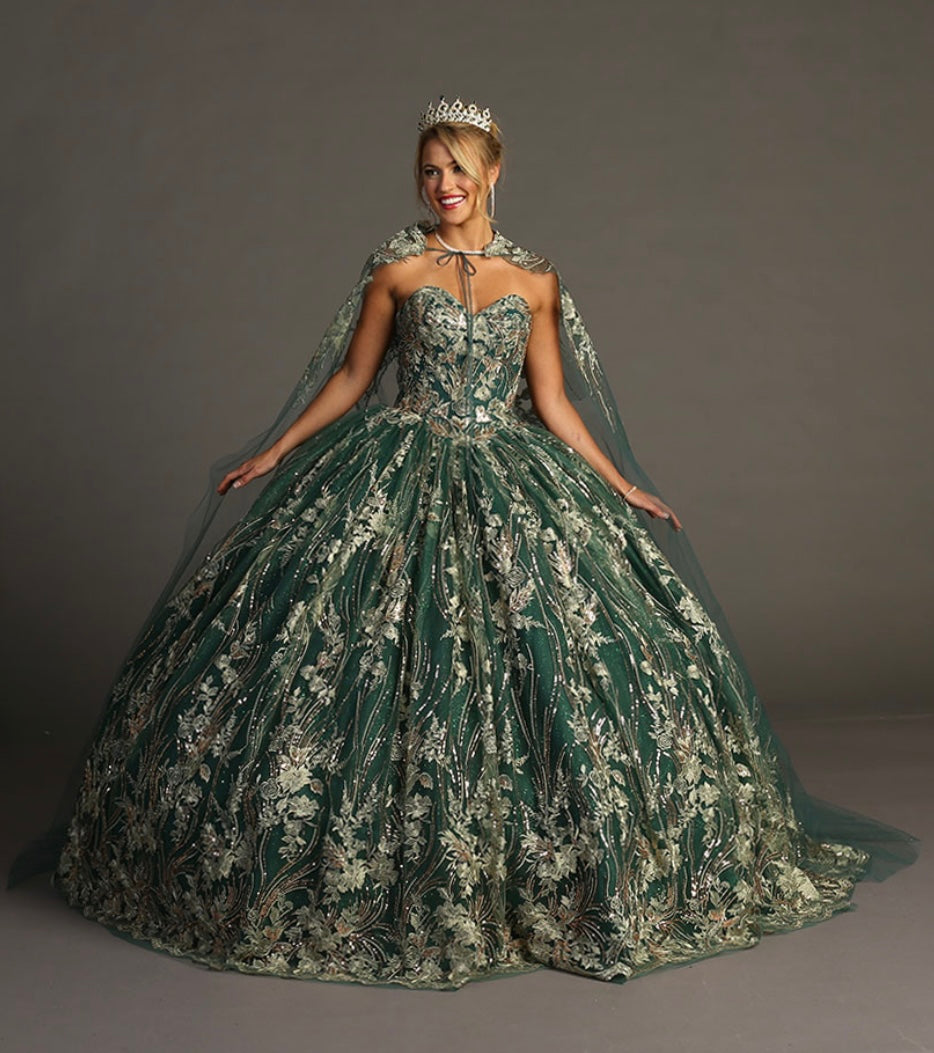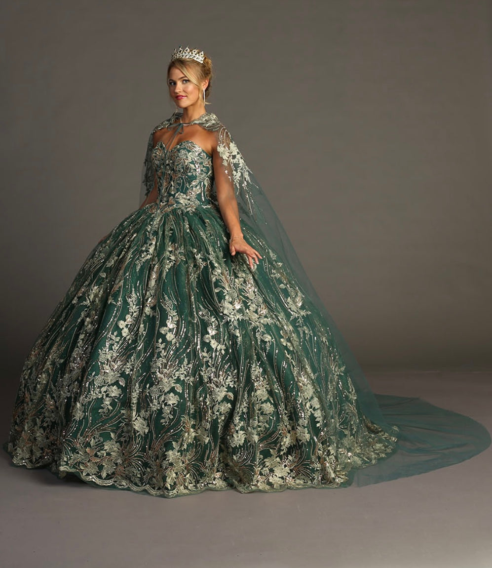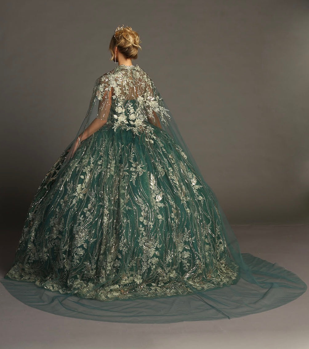 Chicas Design CHF3079 is a majestic ball gown fit for royalty. Featuring an elegant off-the-shoulder neckline and structured bodice, this stunning gown is fully embellished with intricate metallic floral embroidery and shimmering sequins throughout. The voluminous tulle skirt cascades gracefully to the floor, enhanced by a dramatic long train for maximum impact. A matching embroidered cape adds a regal touch, completing the fairytale look. Ideal for quinceañeras or grand formal occasions, this gown is designed to make a breathtaking entrance.