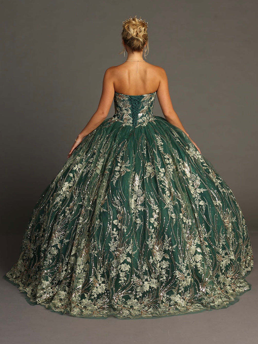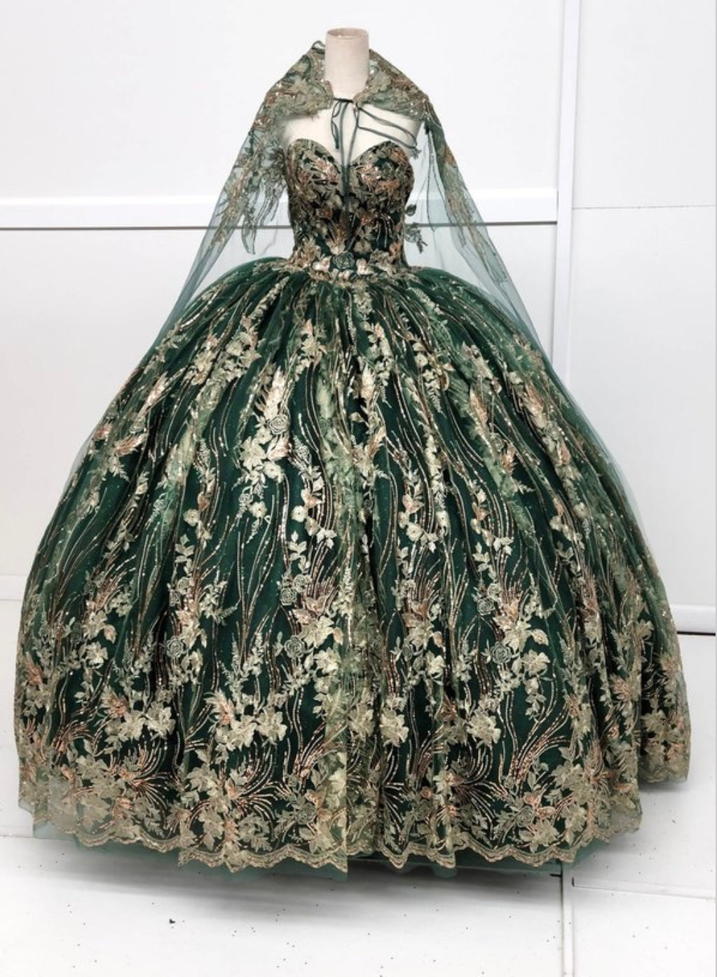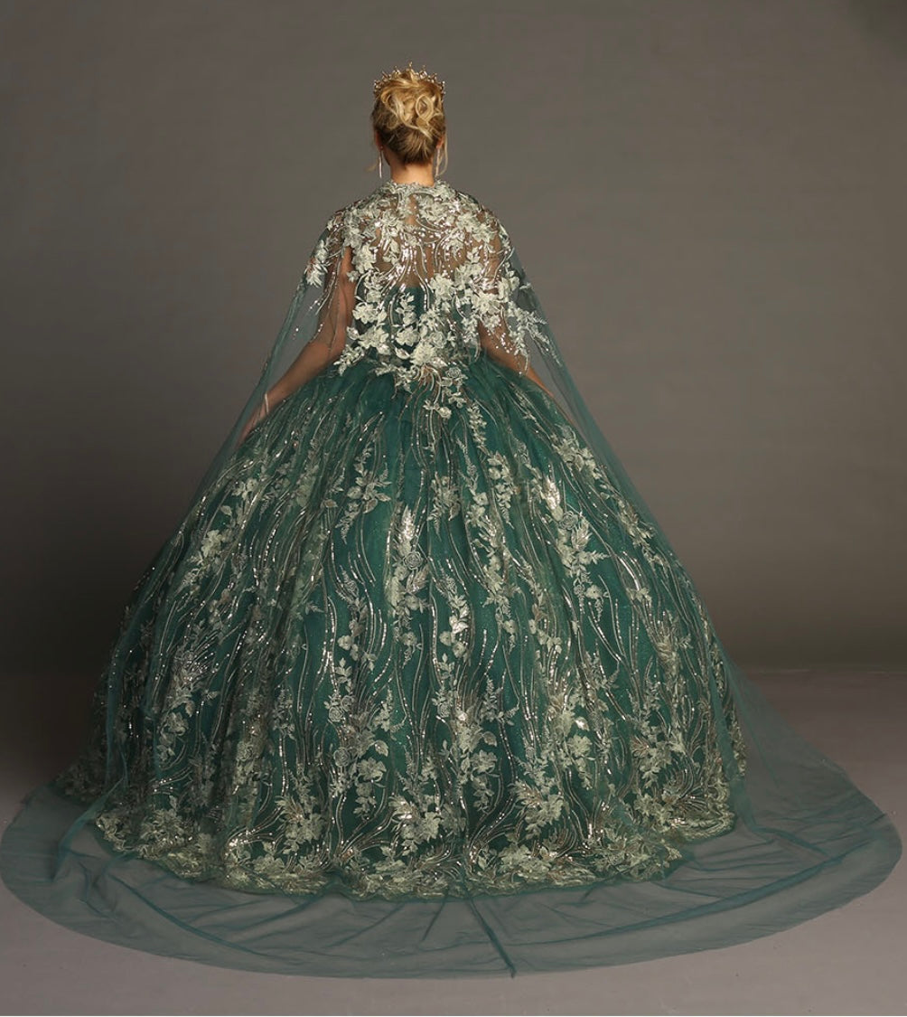 Chicas Design CHF3079 is a majestic ball gown fit for royalty. Featuring an elegant off-the-shoulder neckline and structured bodice, this stunning gown is fully embellished with intricate metallic floral embroidery and shimmering sequins throughout. The voluminous tulle skirt cascades gracefully to the floor, enhanced by a dramatic long train for maximum impact. A matching embroidered cape adds a regal touch, completing the fairytale look. Ideal for quinceañeras or grand formal occasions, this gown is designed to make a breathtaking entrance.