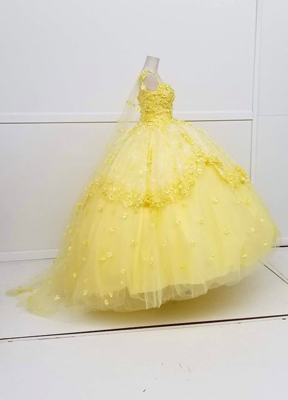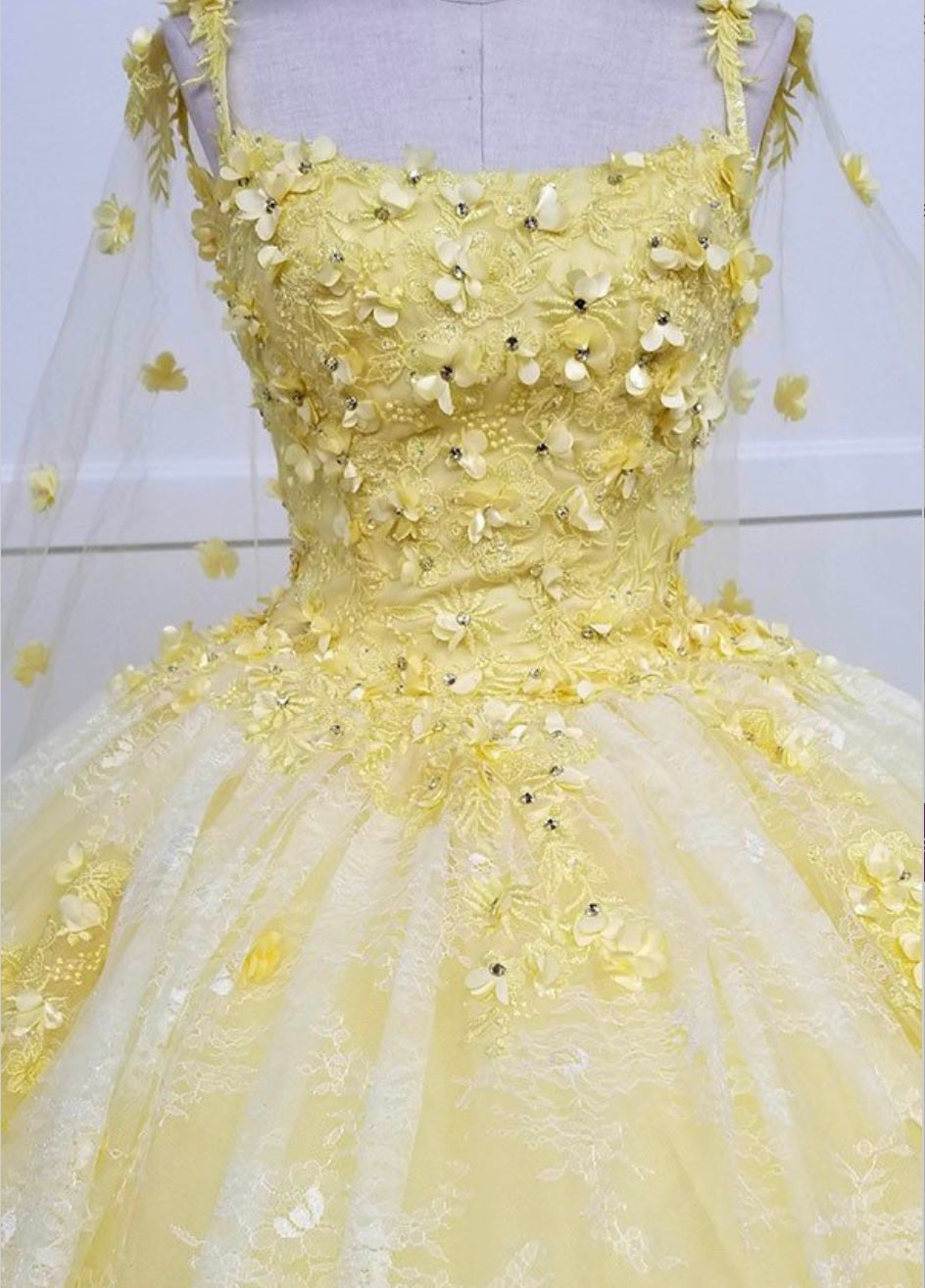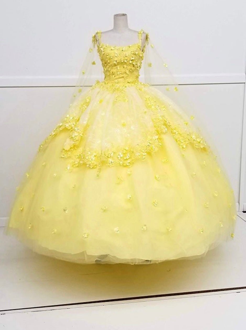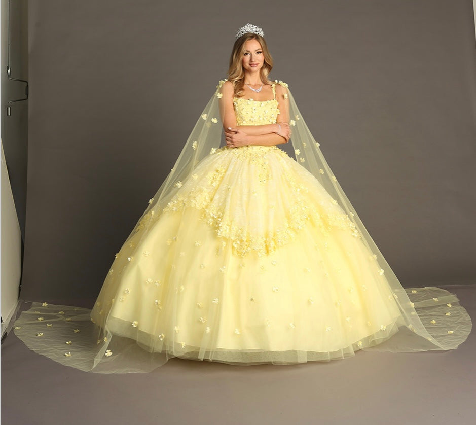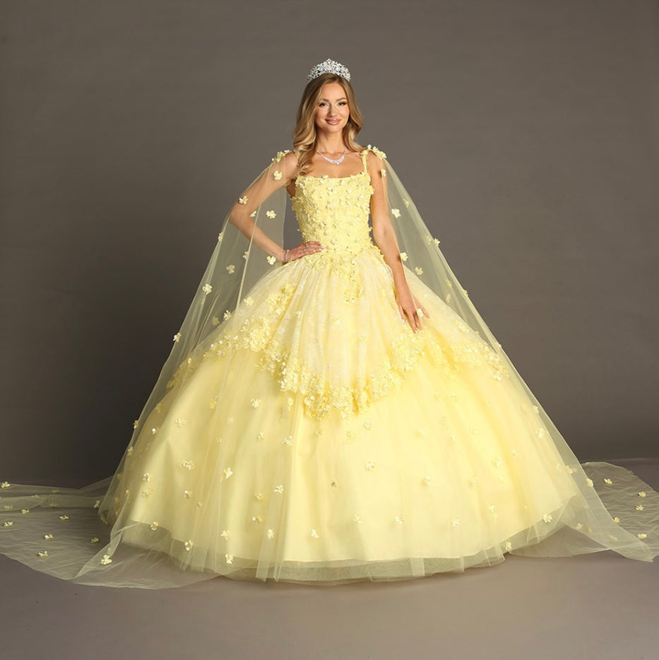 Turn your fairytale dreams into reality with the Chicas gown style CHF3046. This enchanting ball gown features a square neckline with delicate straps, a fully embellished bodice adorned with floral appliqués, and a voluminous layered skirt sprinkled with matching 3D flowers. The look is completed with a dramatic matching cape that trails elegantly behind, creating a true princess moment. Perfect for quinceañeras or themed celebrations, this gown is available in a soft, charming yellow.