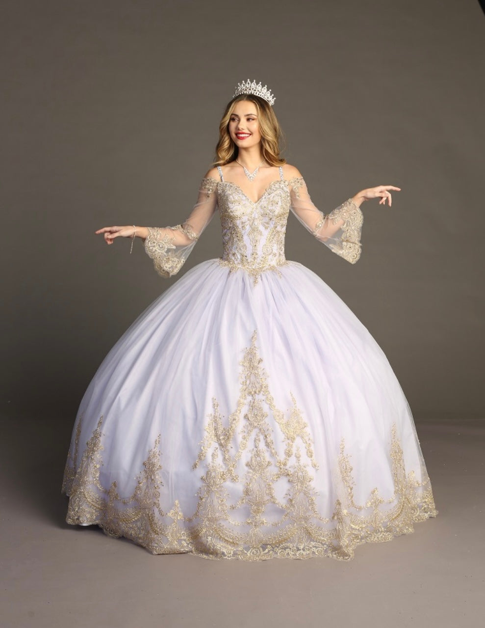 Radiate regal elegance in this majestic ball gown by Chicas, style CHF3033L. Crafted in a luxurious lilac tulle with exquisite gold embroidery, this quinceañera dress features a romantic sweetheart neckline with delicate spaghetti straps and sheer off-the-shoulder long sleeves. The corset-style bodice enhances the waist while the full princess skirt is adorned with ornate gold appliqués that cascade beautifully to the hem. A breathtaking choice for any royal celebration. Available in lilac-gold.