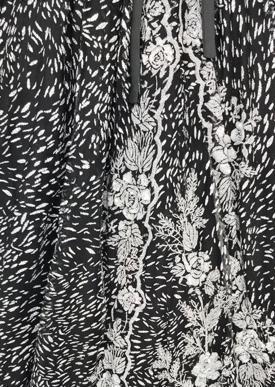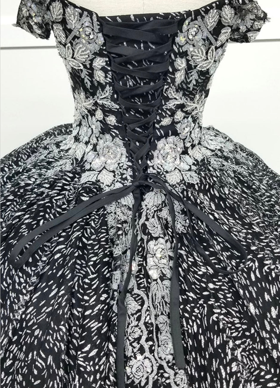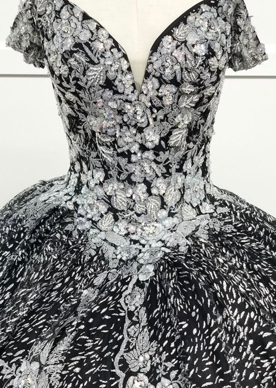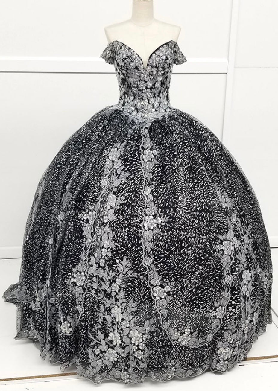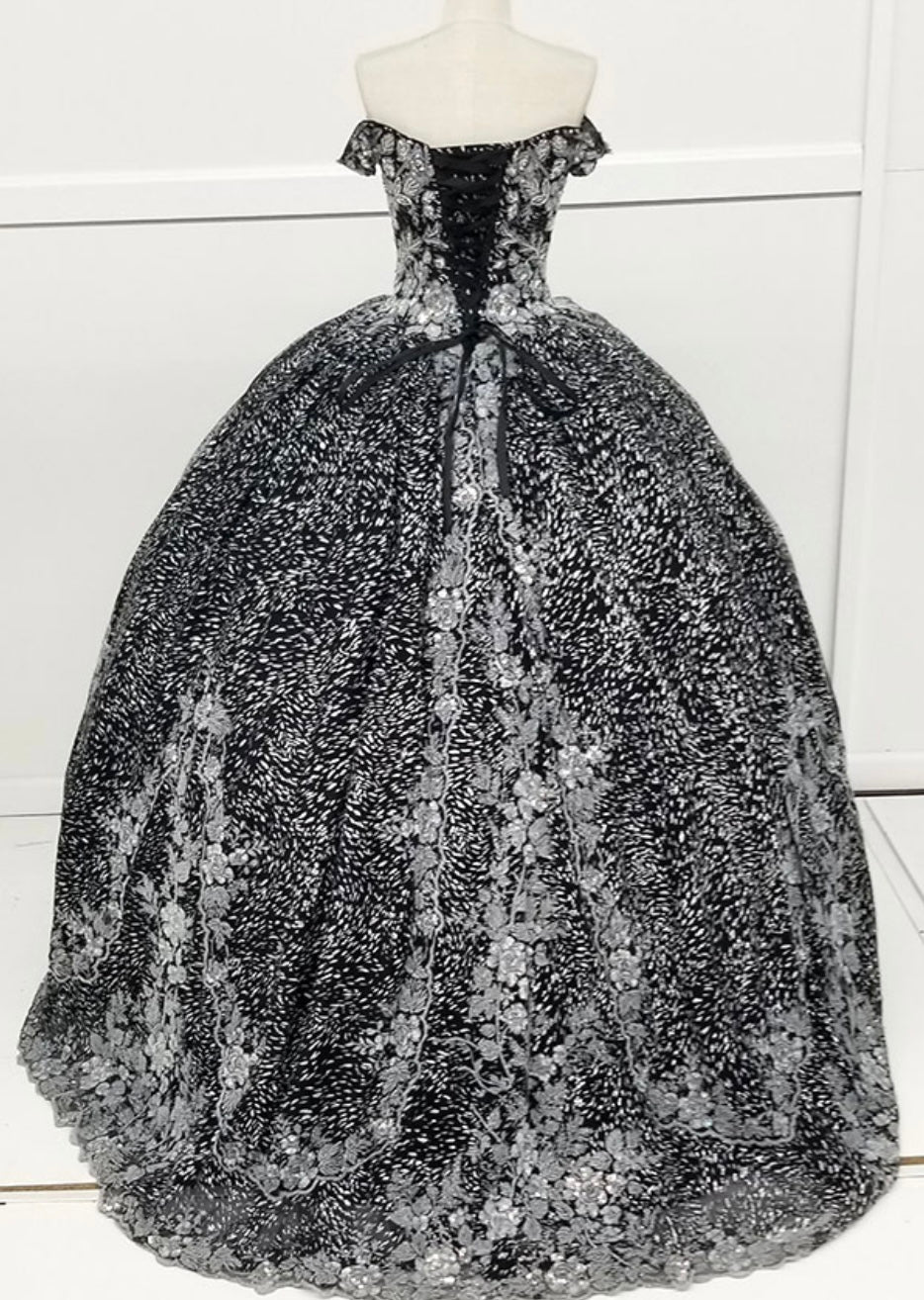 Make a dramatic entrance with the Chicas ball gown style CHF3039. This striking off-the-shoulder dress features a sweetheart neckline and a fitted bodice adorned with intricate silver floral embroidery. The voluminous black skirt is fully embellished with shimmering threadwork and glittering lace appliqués, creating a luxurious and captivating look. Perfect for a quinceañera or special event, this gown embodies elegance with an edge.