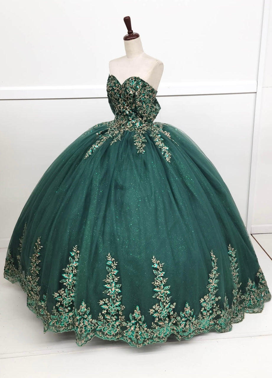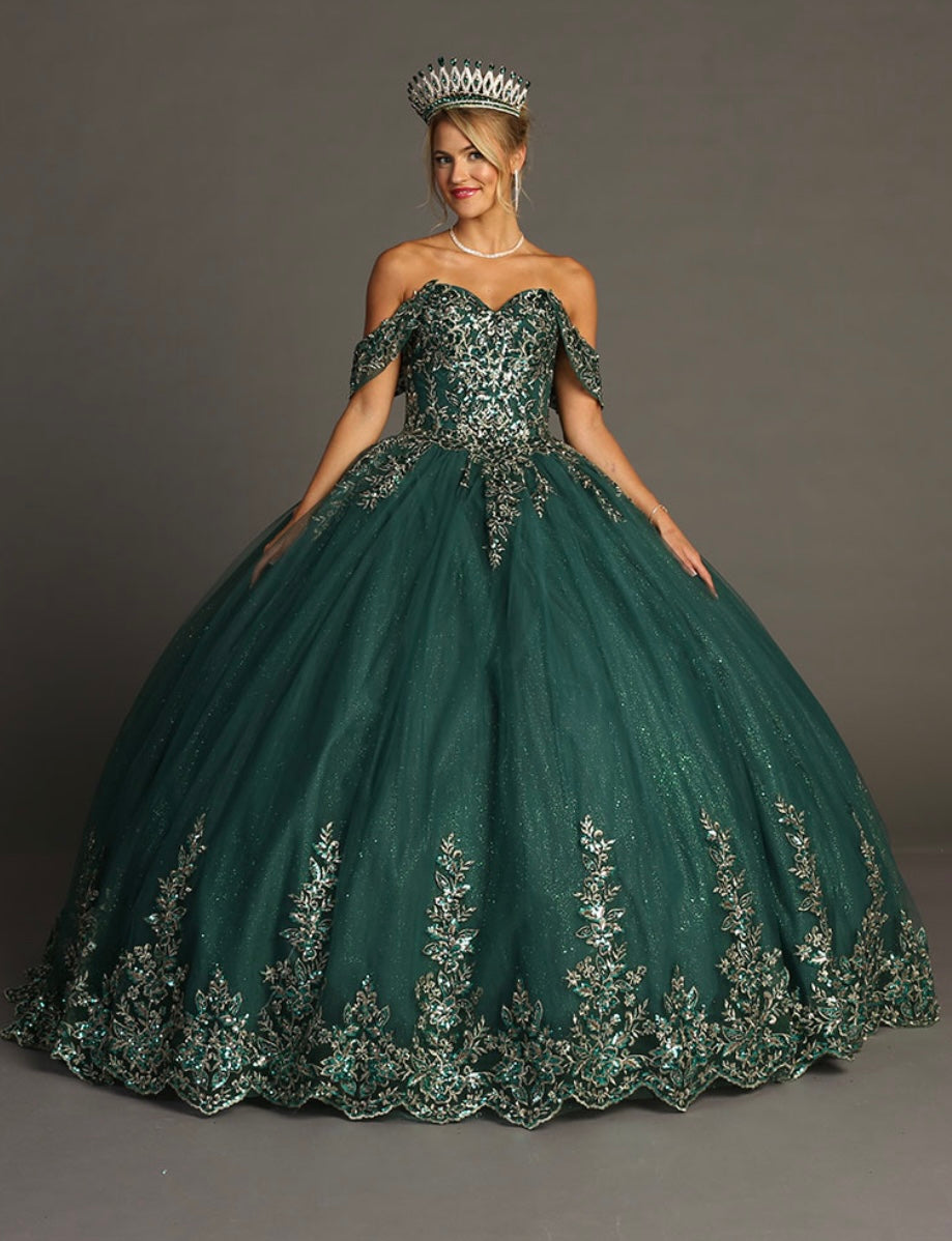 Command attention in this luxurious ball gown by Chicas, style CHF3081. Featuring a sweetheart neckline and off-the-shoulder straps, the fitted bodice is richly embellished with intricate gold embroidery and sparkling sequins. The voluminous tulle skirt glistens with a subtle shimmer and is adorned with ornate embroidered patterns that extend along the hemline for a regal finish. Perfect for quinceañeras and formal occasions, this gown radiates elegance and grandeur.