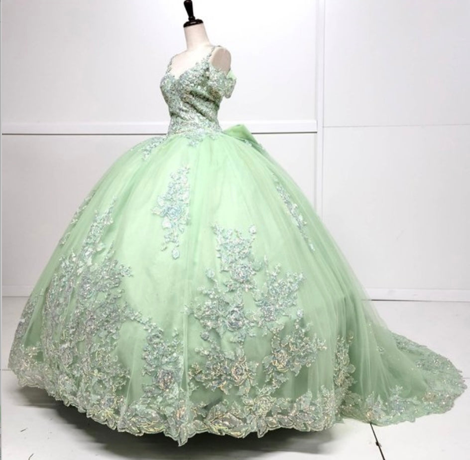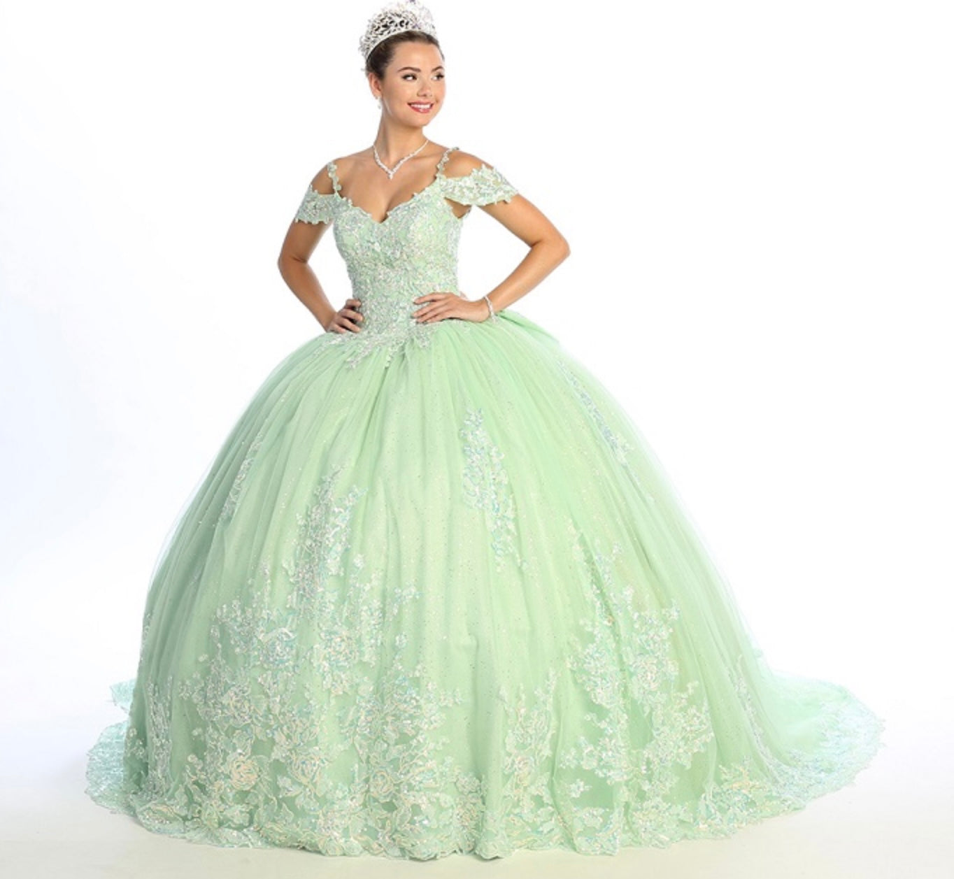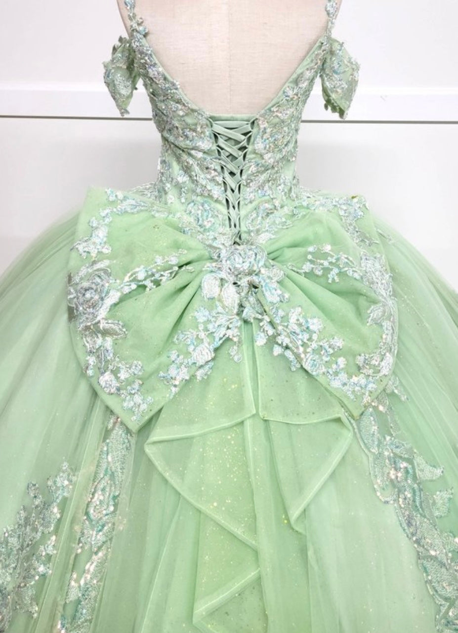 Step into your dream celebration with this breathtaking ball gown by Chicas, style CHF3089. This enchanting design features a sweetheart neckline with delicate off-the-shoulder straps and thin spaghetti accents for added elegance. The fitted bodice is richly adorned with intricate floral embroidery and shimmering appliqués that cascade beautifully onto the full glitter tulle skirt. Perfect for quinceañeras or royal-inspired events, this gown delivers a magical, fairy-tale look from every angle.