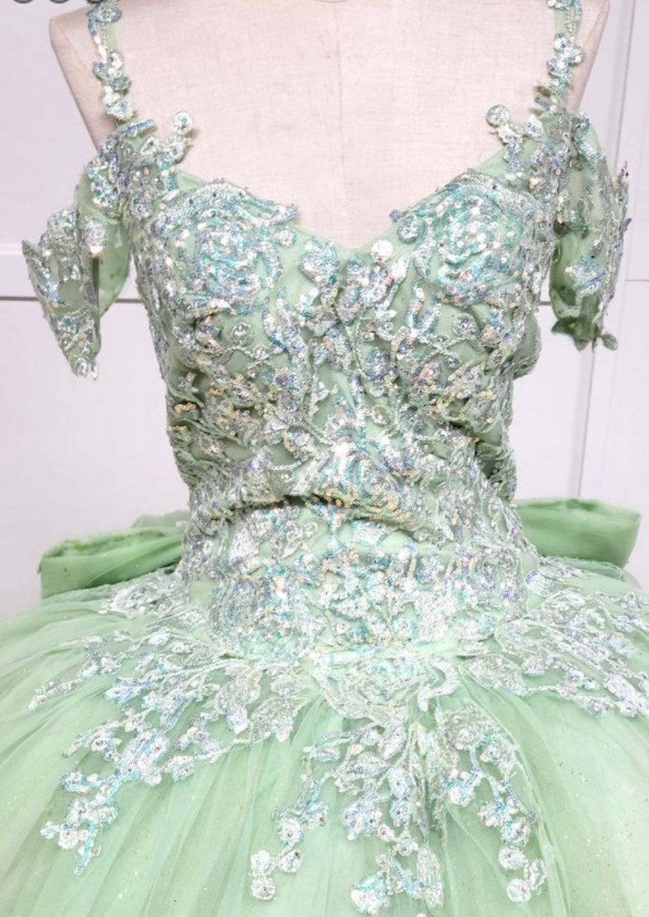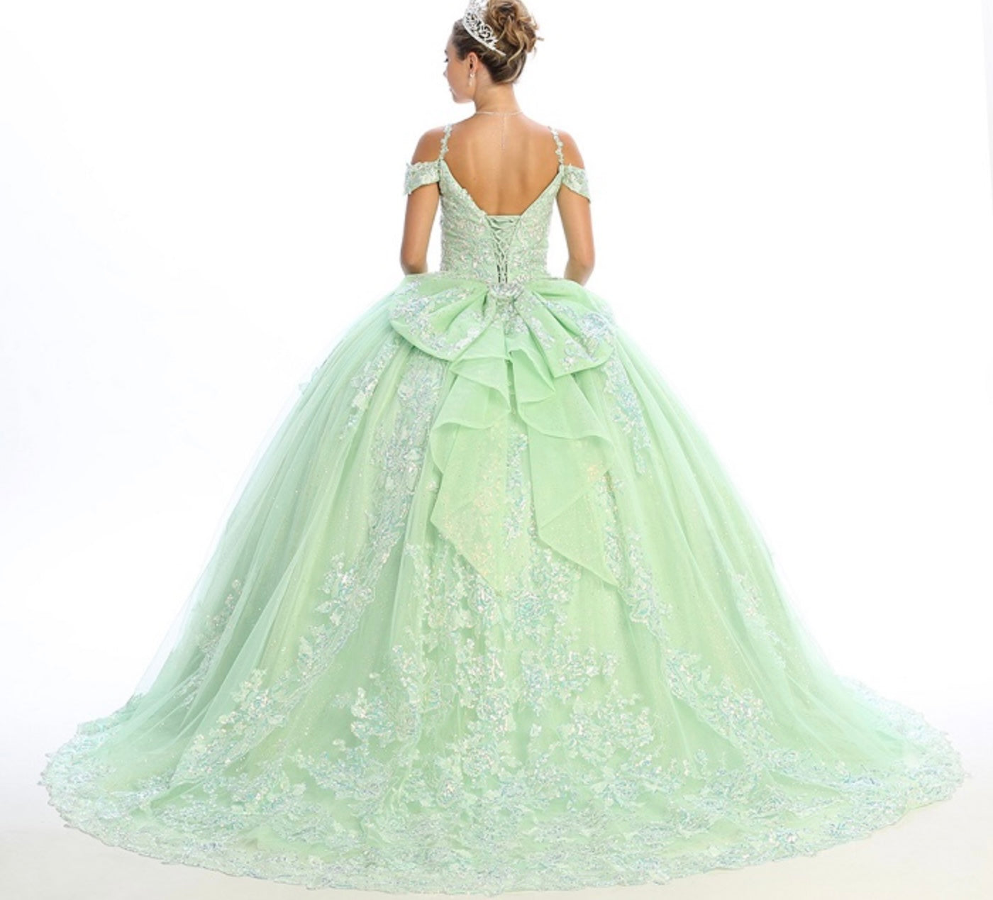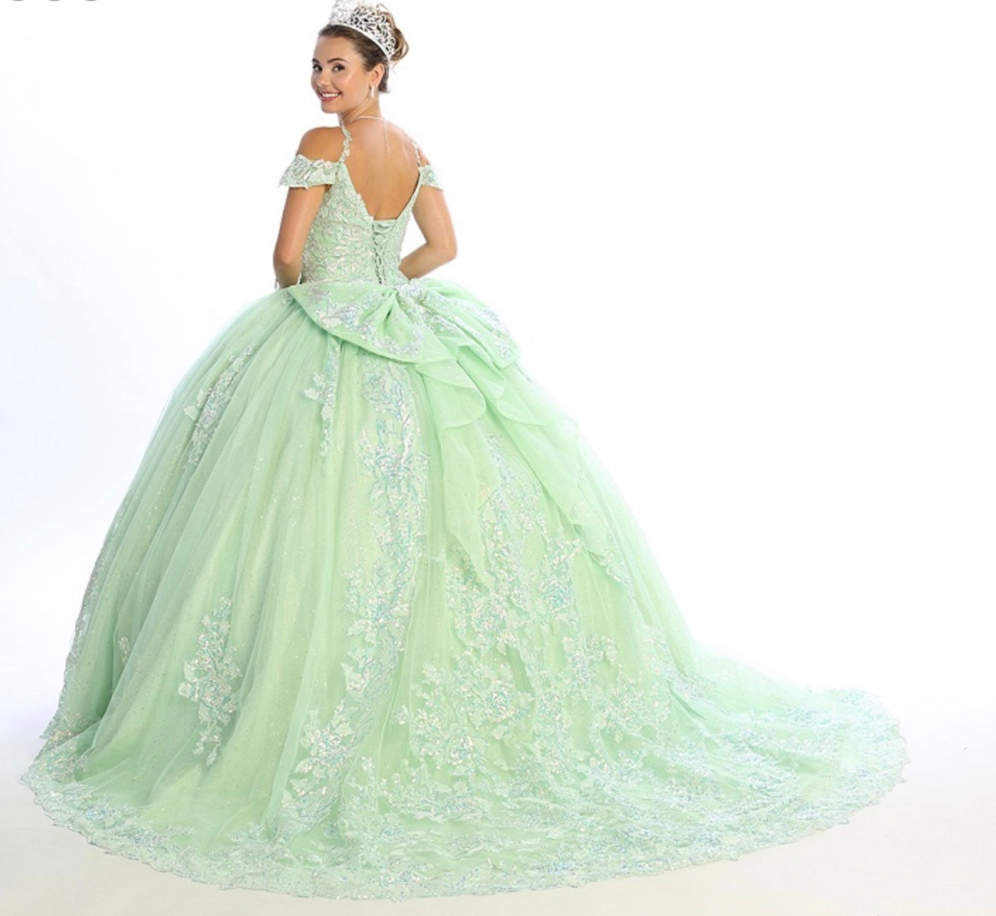Step into your dream celebration with this breathtaking ball gown by Chicas, style CHF3089. This enchanting design features a sweetheart neckline with delicate off-the-shoulder straps and thin spaghetti accents for added elegance. The fitted bodice is richly adorned with intricate floral embroidery and shimmering appliqués that cascade beautifully onto the full glitter tulle skirt. Perfect for quinceañeras or royal-inspired events, this gown delivers a magical, fairy-tale look from every angle.