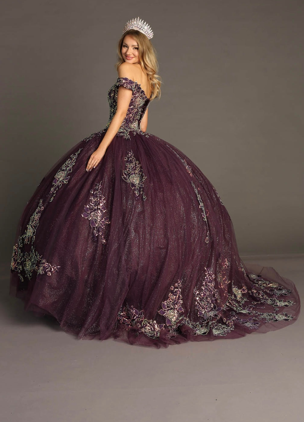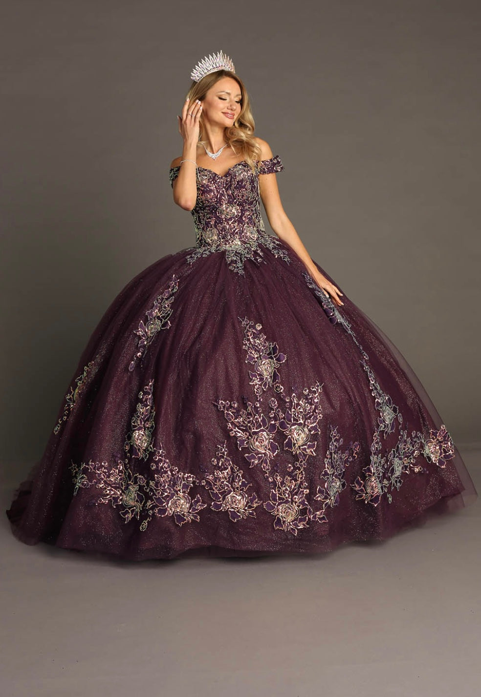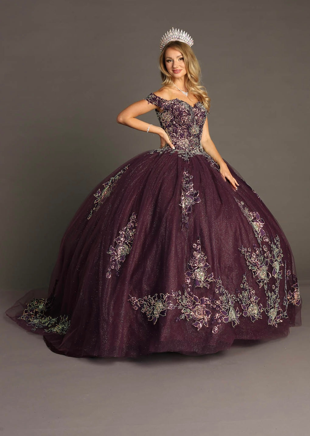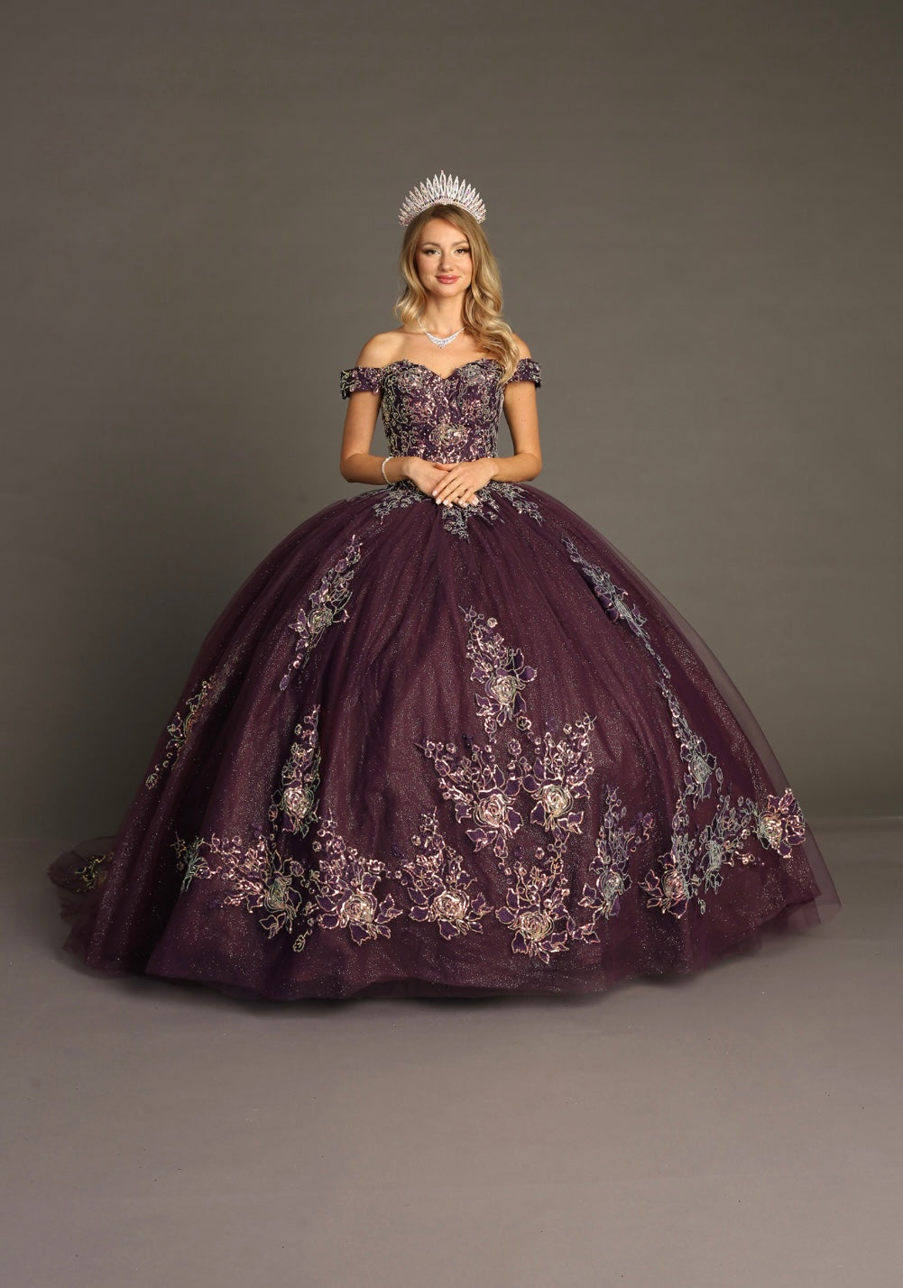 Feel like royalty in this breathtaking ball gown by Chicas, style CHF3099. Available in a regal purple shade, this off-the-shoulder dress features a structured corset bodice adorned with shimmering embroidery and 3D floral appliqués. The full tulle skirt is decorated with intricate glitter details and floral patterns that add depth and elegance. Perfect for quinceañeras, galas, or any grand celebration that calls for a truly majestic look.