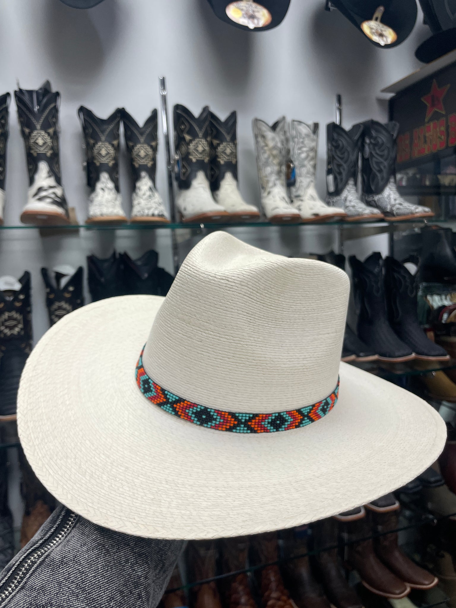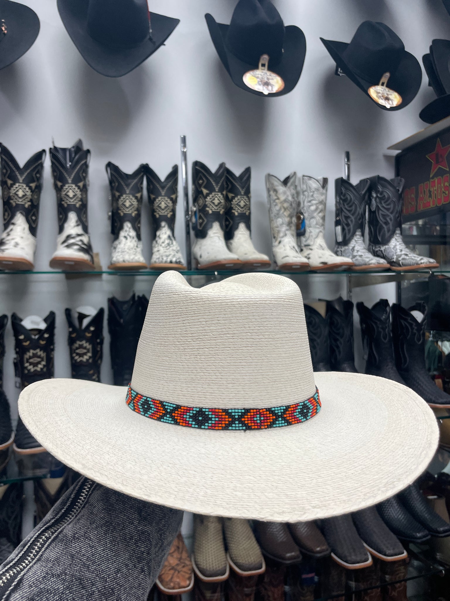 This Corral straw hat blends classic western style with eye-catching detail. Crafted from lightweight, breathable straw, it features a clean, structured crown and a wide brim designed for all-day comfort and sun protection. The standout detail is the colorful beaded hatband with a bold Southwestern-inspired pattern, adding a vibrant contrast to the natural straw finish. Perfect for rodeos, festivals, or everyday western wear, this hat delivers timeless appeal with a modern Corral touch.