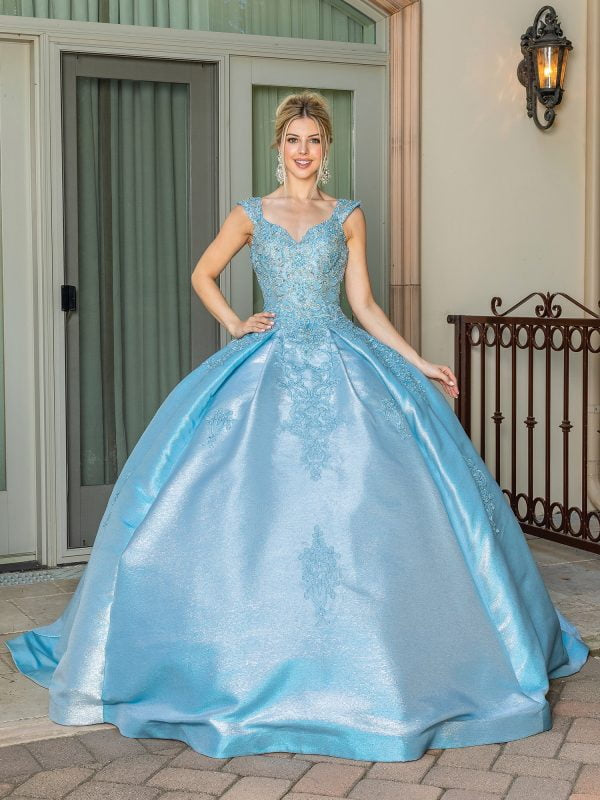 Step into your quinceañera with confidence and grace in the Dancing Queen Quinceañera Dress 1585. This enchanting ball gown features an off-the-shoulder neckline and a fully embellished bodice adorned with intricate embroidery and dazzling details that add a touch of royal elegance. The voluminous tulle skirt flows beautifully, enhanced with ornate appliqués that create a captivating, princess-like silhouette. A lace-up corset back provides a secure, customizable fit, ensuring all-day comfort while flattering your figure. Designed for unforgettable moments, this gown brings your fairytale vision to life with timeless charm.