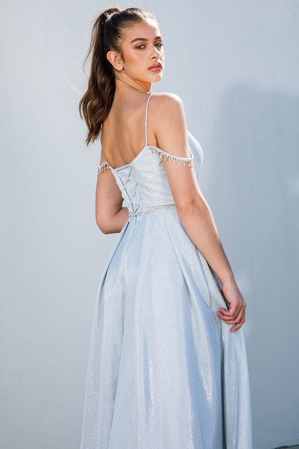 Graceful with a touch of glam, the Eureka 9800 is a floor-length A-line gown crafted in a beautiful shimmer-toned fabric that catches the light with every step. It features a pleated, shaped bust for a structured fit, a delicate slit for added elegance, and an off-shoulder jeweled chain detail that adds a luxurious finish. The corset back ensures a flattering and adjustable fit. Available in Peri Blue, Rose Gold, and Silver.