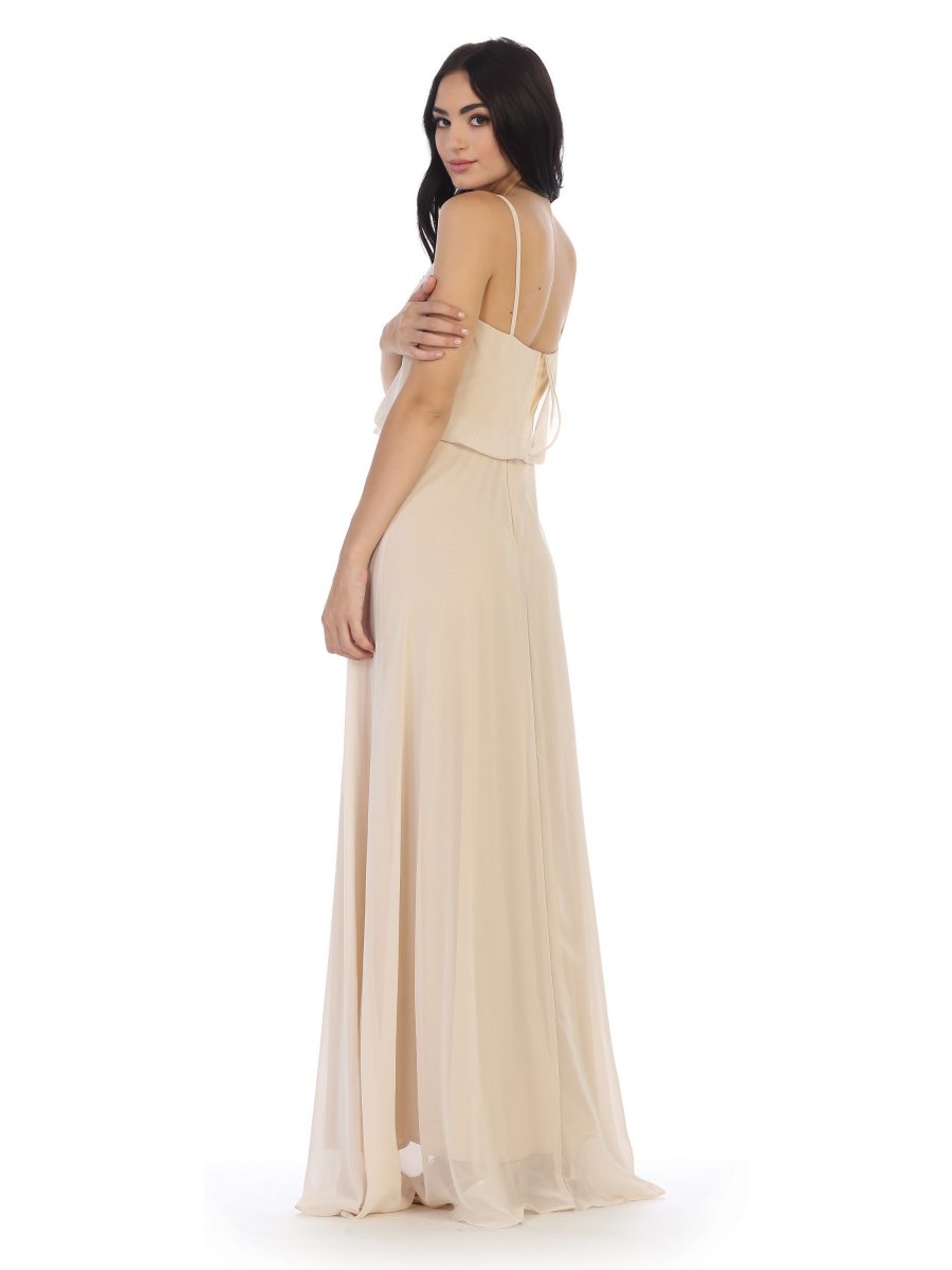 Eva Evening Gowns 3318 features an elegant blouson top design, creating a flattering and sophisticated silhouette. The gown drapes gracefully, offering comfort and style for special occasions. Its refined construction highlights a timeless aesthetic, perfect for bridesmaids, evening events, or formal gatherings. The attention to detail ensures a polished and graceful look from every angle, making it a standout choice for memorable occasions.