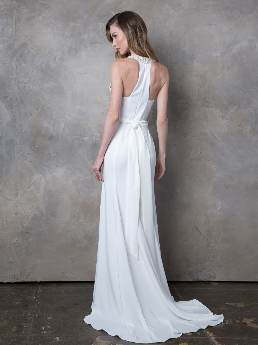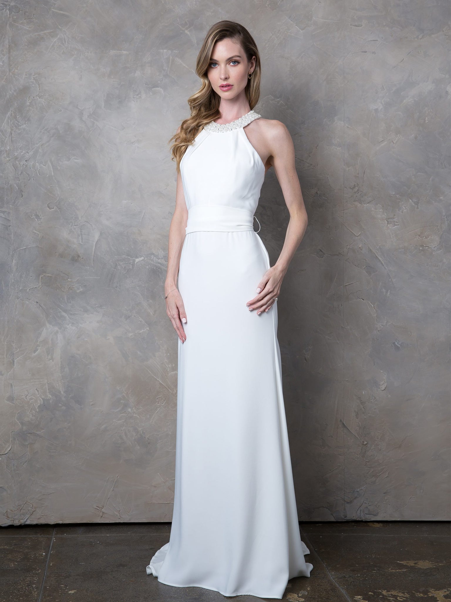 The Eva Evening Gowns 3408 showcases a sophisticated halter neckline with intricate beaded detailing, adding a touch of sparkle to its elegant design. This sleeveless gown features a flattering waist tie that accentuates the silhouette, creating a graceful and polished look for any formal occasion. Its refined craftsmanship and delicate embellishments make it an excellent choice for weddings, galas, or special events.