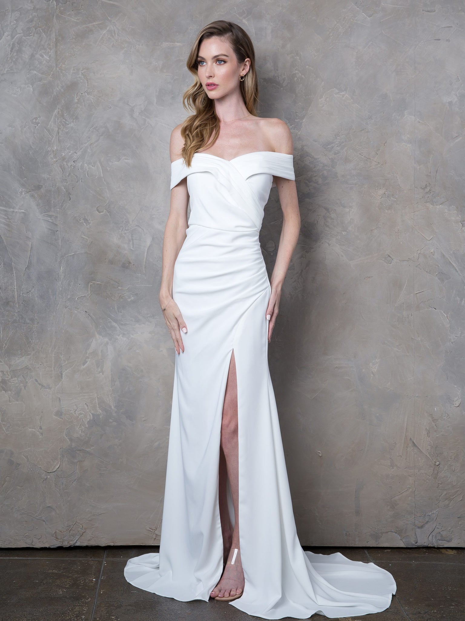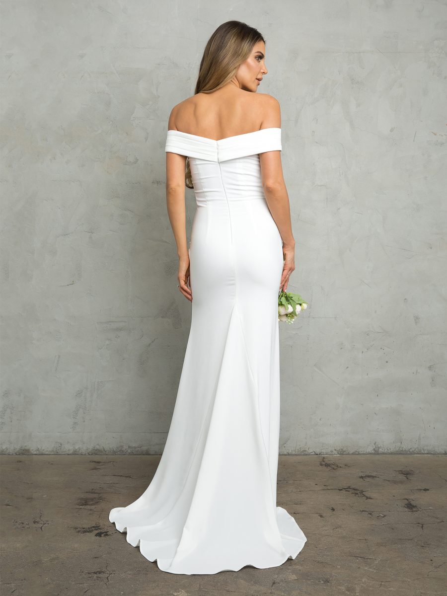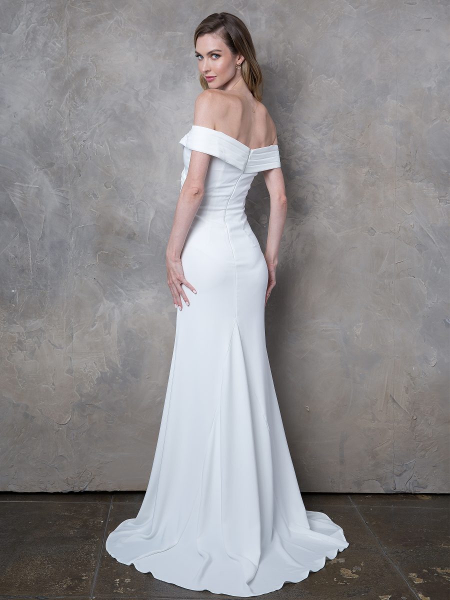 The Eva Evening Gowns 3418 showcases an elegant off-shoulder design crafted from a smooth, fitted crepe fabric. This gown beautifully contours the body, highlighting a sophisticated silhouette that is perfect for formal occasions. Its sleek and modern style offers timeless appeal, making it an ideal choice for evening events, galas, or weddings.
