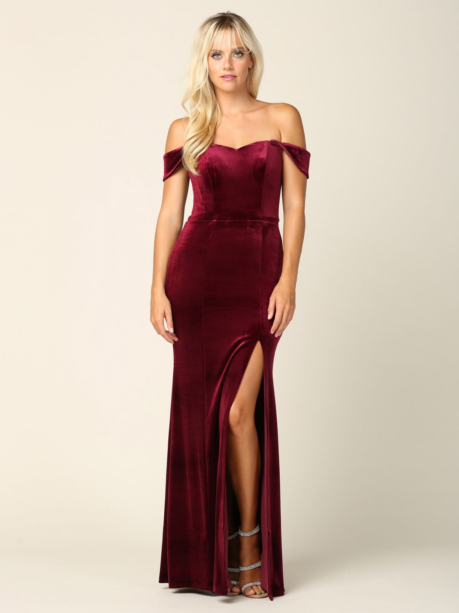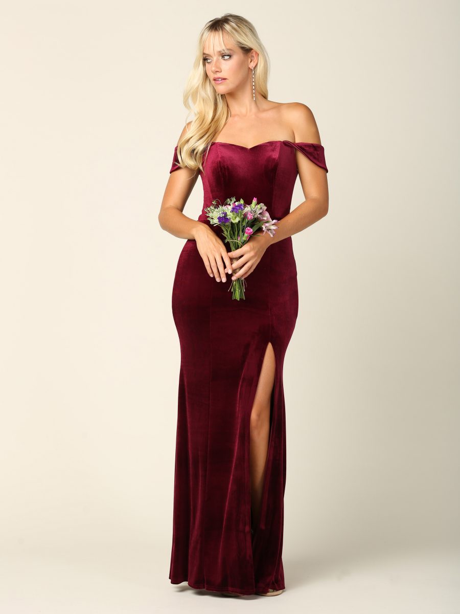 The Eva Evening Gowns 3430 showcases an elegant off-shoulder design made from luxurious velvet fabric. This gown features a sophisticated front slit that adds a touch of allure while maintaining a refined silhouette. Perfect for formal events, galas, or special occasions, this dress combines classic style with modern details to create a stunning look.