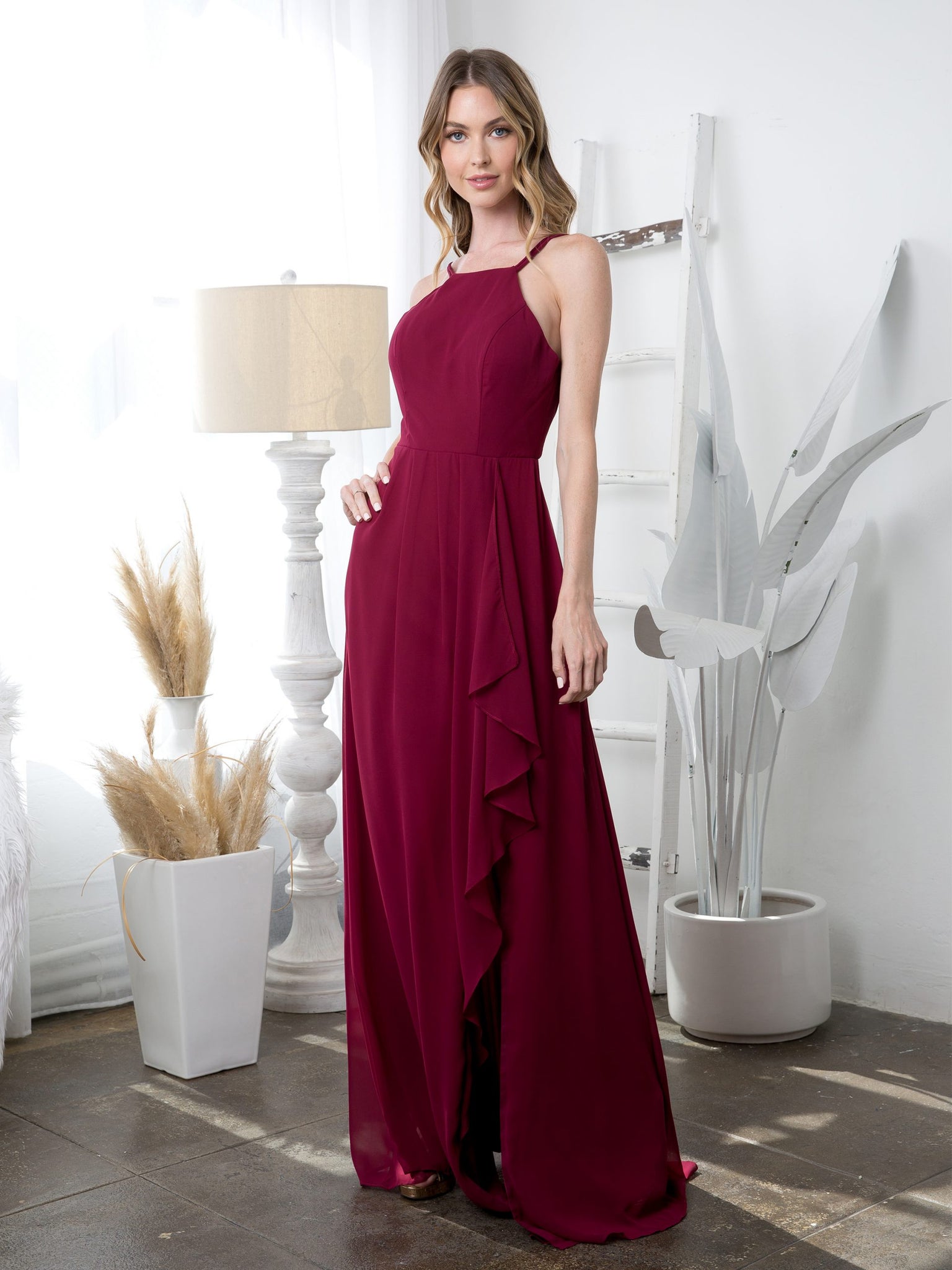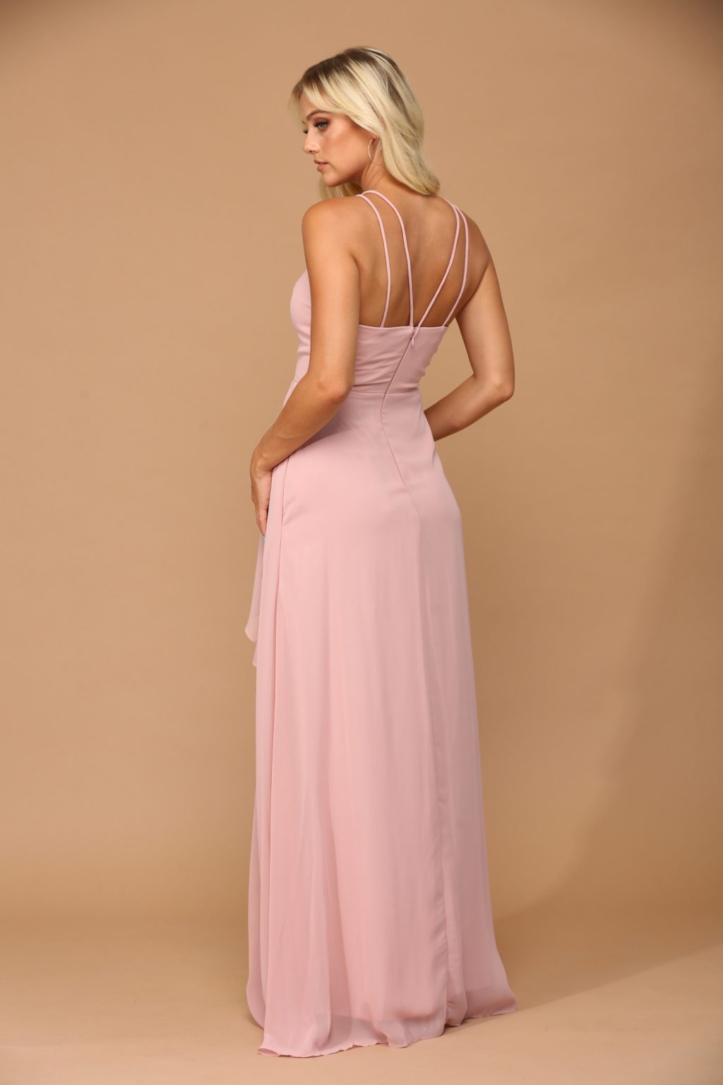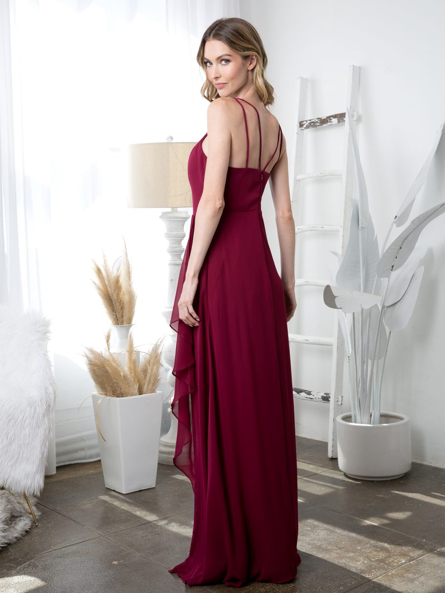 Eva Evening Gowns 3440 is a graceful floor-length chiffon gown designed in a classic A-line silhouette. It features a chic halter-style neckline and a front slit that adds movement and elegance. Fully lined for comfort, this gown includes built-in bra cups for support, a back zipper for easy wear, and convenient pockets, blending style with practicality for any formal occasion.