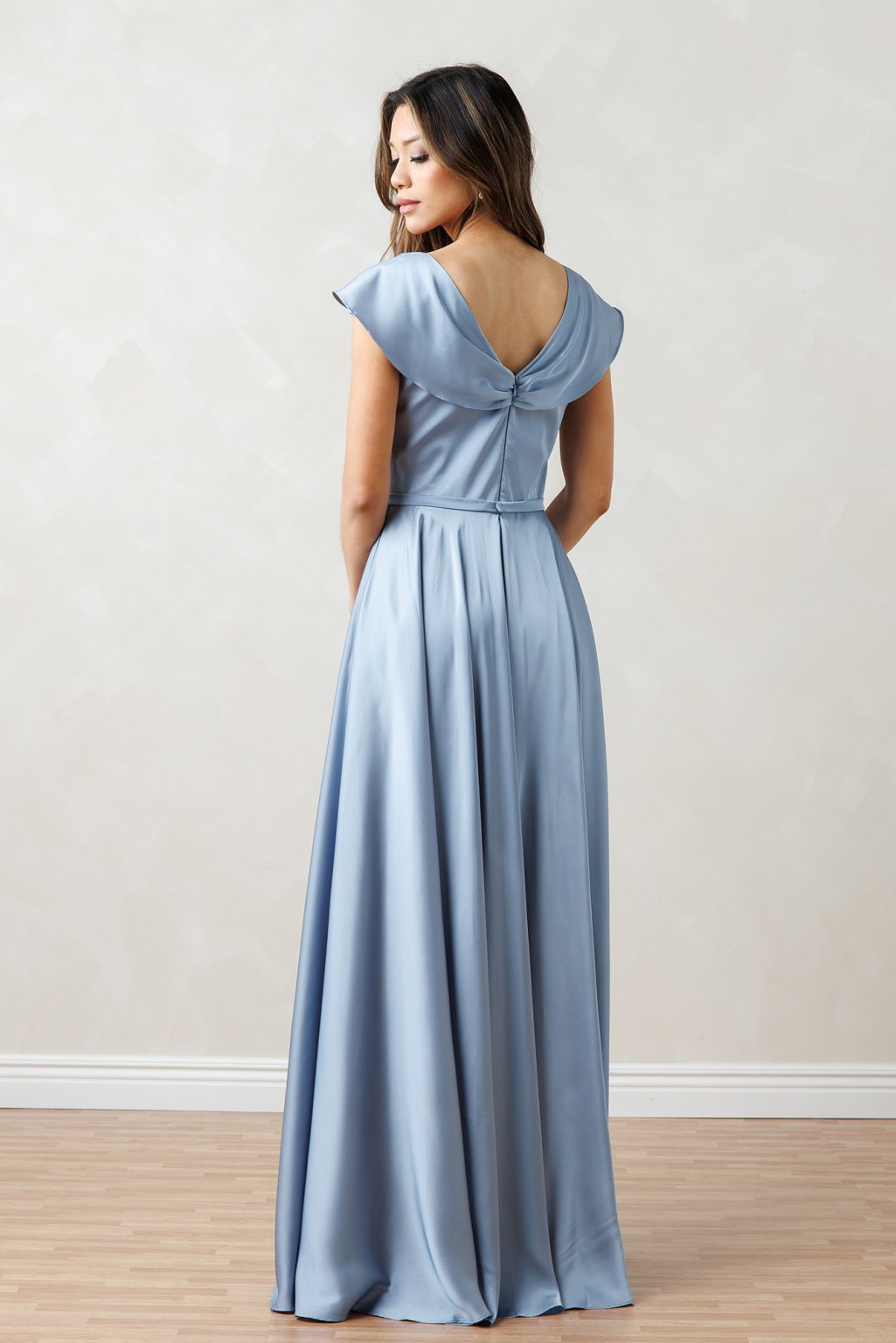 Satin A-line dress featuring flutter cap sleeves that elegantly drape at the back, a matching belt with snap button and hook-and-eye closures that can be removed, and a front slit for added movement. The dress is fully lined and includes built-in bra cups for support. It closes with a back zipper and has convenient pockets.