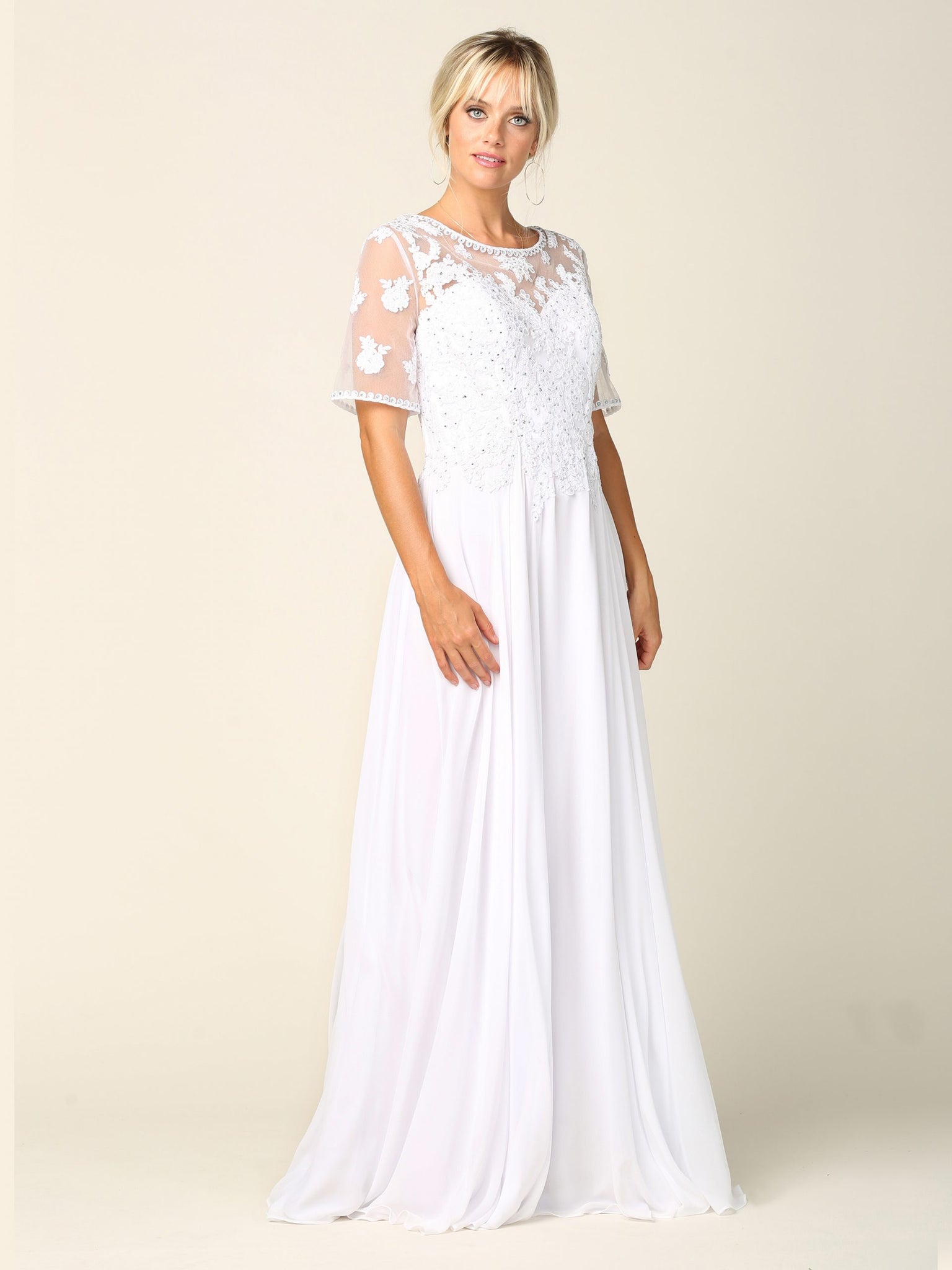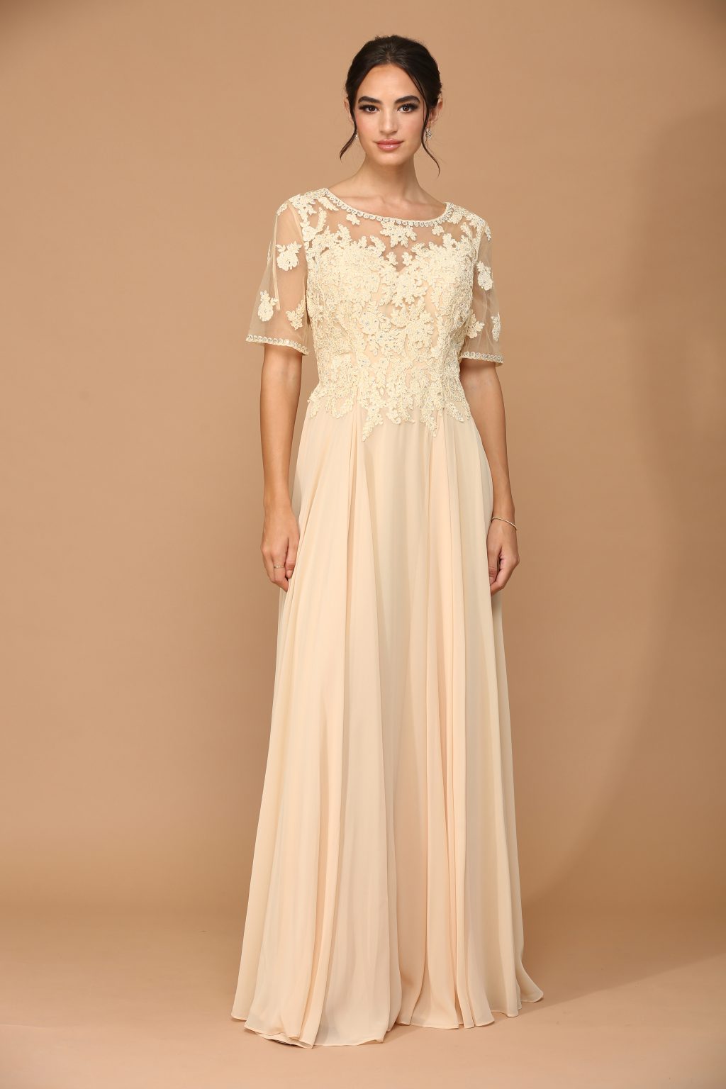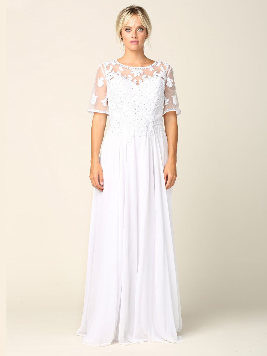Eva Evening Gowns 5221 is a graceful half-sleeve chiffon gown designed with intricate embroidered appliques on the bodice, accented with delicate stones for a touch of sparkle. The gown is fully lined and includes built-in bra cups to ensure comfort and support. A back zipper provides ease of wear while maintaining a smooth and elegant silhouette, making this style perfect for formal occasions and special celebrations.