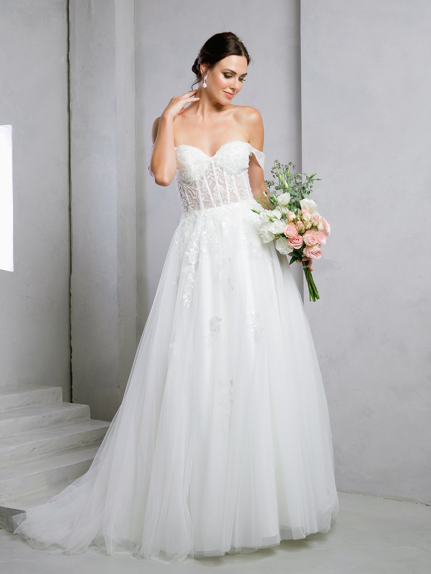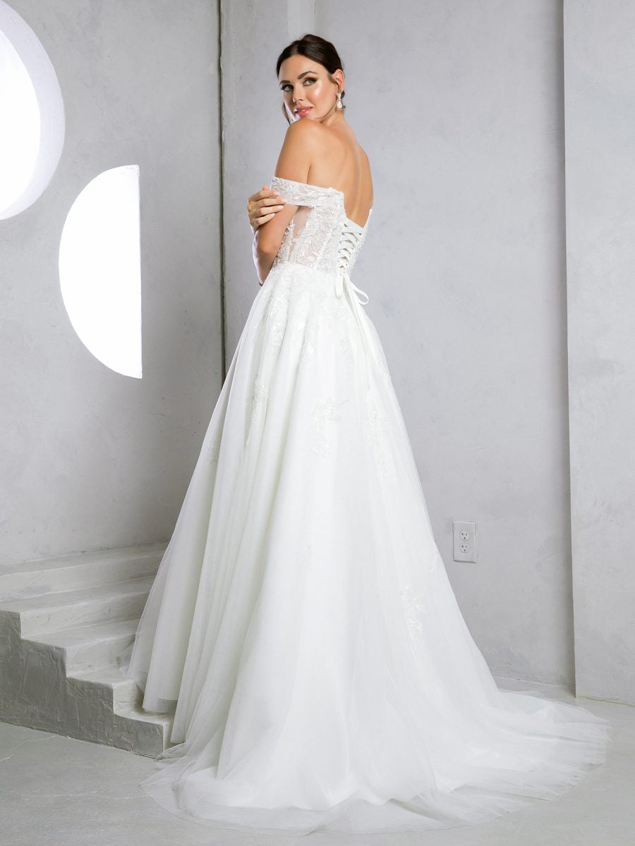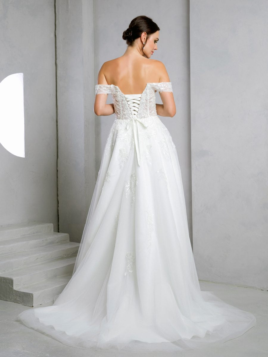 The Eva Evening Gowns 5275 showcases an off-shoulder design crafted with intricate lace and delicate beaded tulle. The bustier-style sweetheart bodice features structured boning details and sheer side panels adorned with beaded lace appliques throughout. Fully lined and equipped with built-in bra cups, this gown ensures comfort and support. The back zip closure is complemented by a corset tie for adjustable sizing. Beaded lace appliques are elegantly placed around the flowing tulle skirt, which extends into a graceful sweep train, perfect for formal occasions.