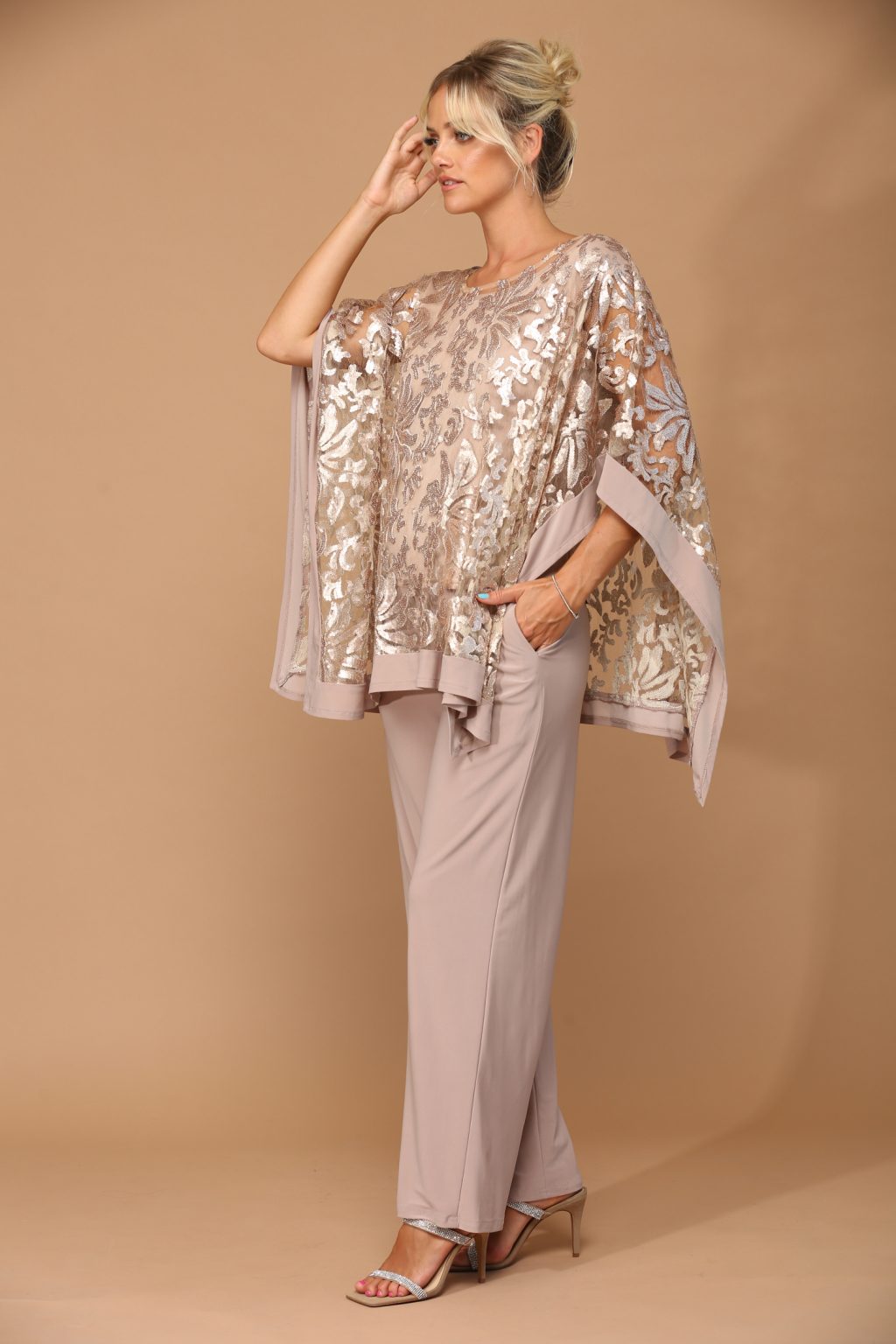 Turn heads with the Eva Evening Gowns 3443, a modern and glamorous ensemble perfect for any upscale event. This sophisticated stretch jersey pant set offers both comfort and elegance, featuring a flattering fit that moves with you. The look is elevated by a dazzling sequin cape overlay with an attached tank, creating a layered effect that adds dimension and sparkle. Ideal for formal dinners, receptions, or special celebrations, this design effortlessly blends style and grace.