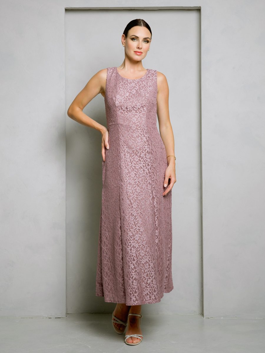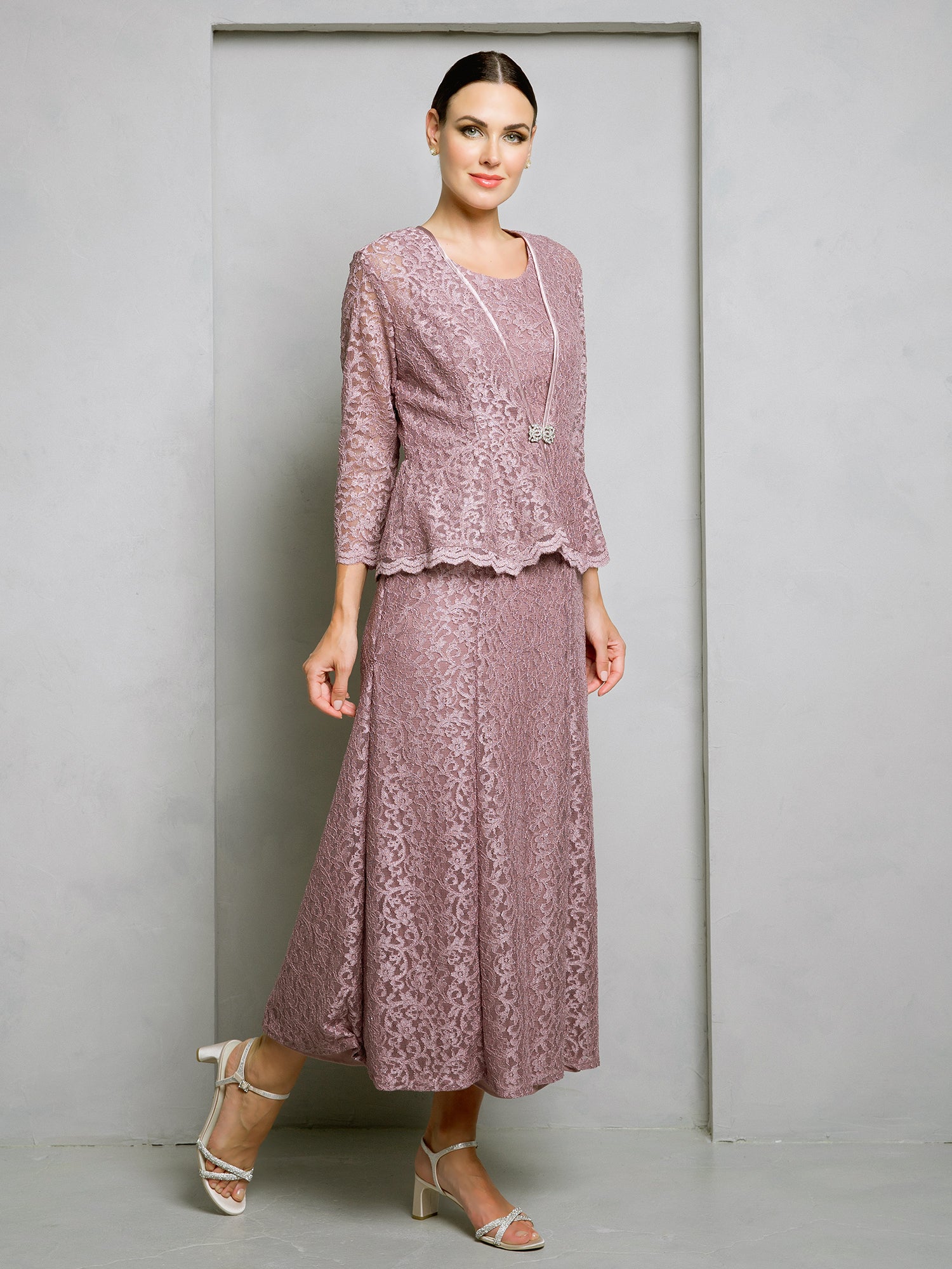 Elegant and timeless, the Eva Evening Gowns 3504 is a two-piece ensemble crafted for sophisticated occasions. This set features a sleeveless tea-length dress adorned with glittered lace, offering a graceful and classic silhouette. The dress is fully lined and includes a convenient back zipper for ease of wear. Completing the look is a matching jacket designed with a scalloped hem and a flattering faux peplum shape. An attached brooch and hook closure add a refined finishing touch. The relaxed fit ensures comfort while maintaining a polished appearance, making it ideal for formal gatherings or special celebrations.