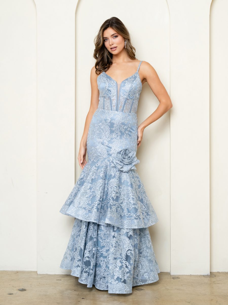 Eva Evening Gowns 3507 is a sophisticated fit and flare gown crafted with intricate embroidered lace and elegant floral detailing. The structured bodice features supportive boning for a flattering shape, while the corset back adds both charm and adjustability for a customized fit. Fully lined and equipped with built-in bra cups, this gown offers both comfort and style—perfect for formal occasions, proms, or special events.