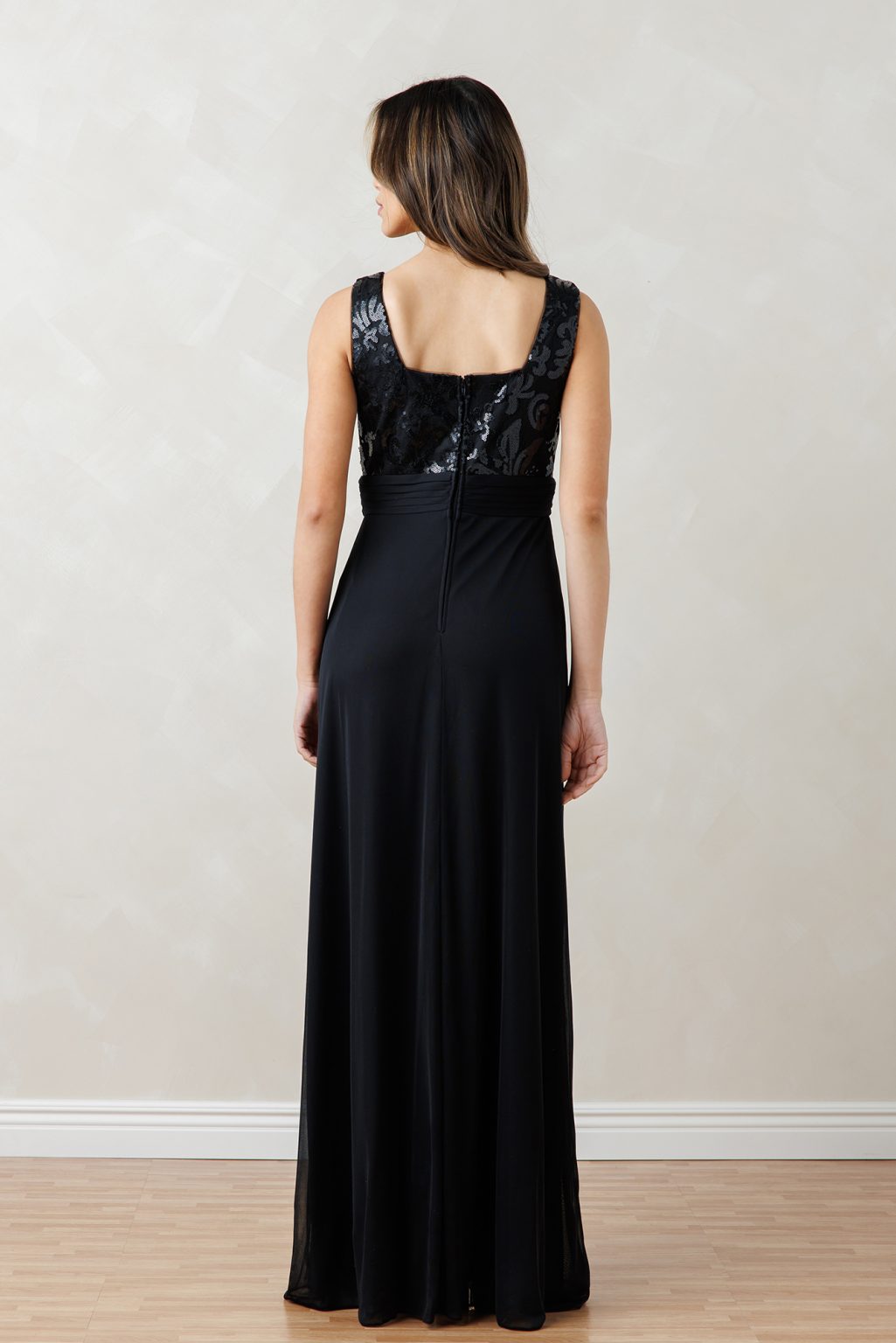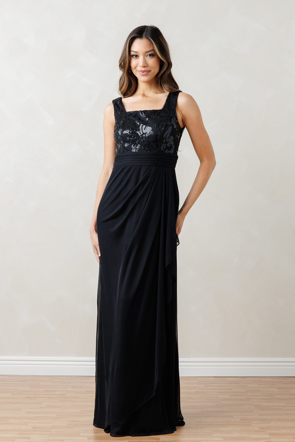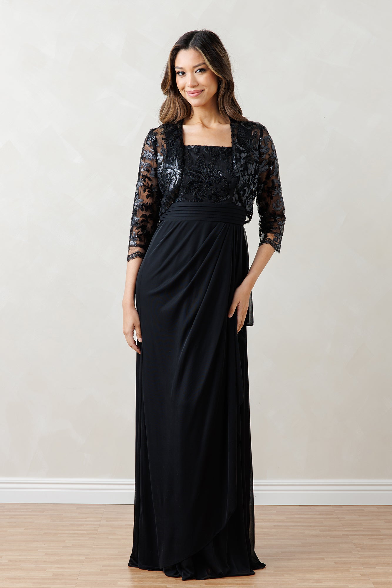 The Eva Evening Gowns 3531 is a two-piece ensemble featuring a sleeveless dress paired with a coordinating sequined lace bolero. The dress showcases a classic square neckline and is designed with mesh trim along the edges for added comfort. The bodice is adorned with delicate sequined floral lace, while the skirt is crafted from a soft, stretch chiffon that offers ease of movement. It has a relaxed fit, is fully lined, and includes a back zipper for convenience. The matching bolero is also fully lined with mesh and features elegant 3/4 sleeves finished with scalloped edges for a refined touch.