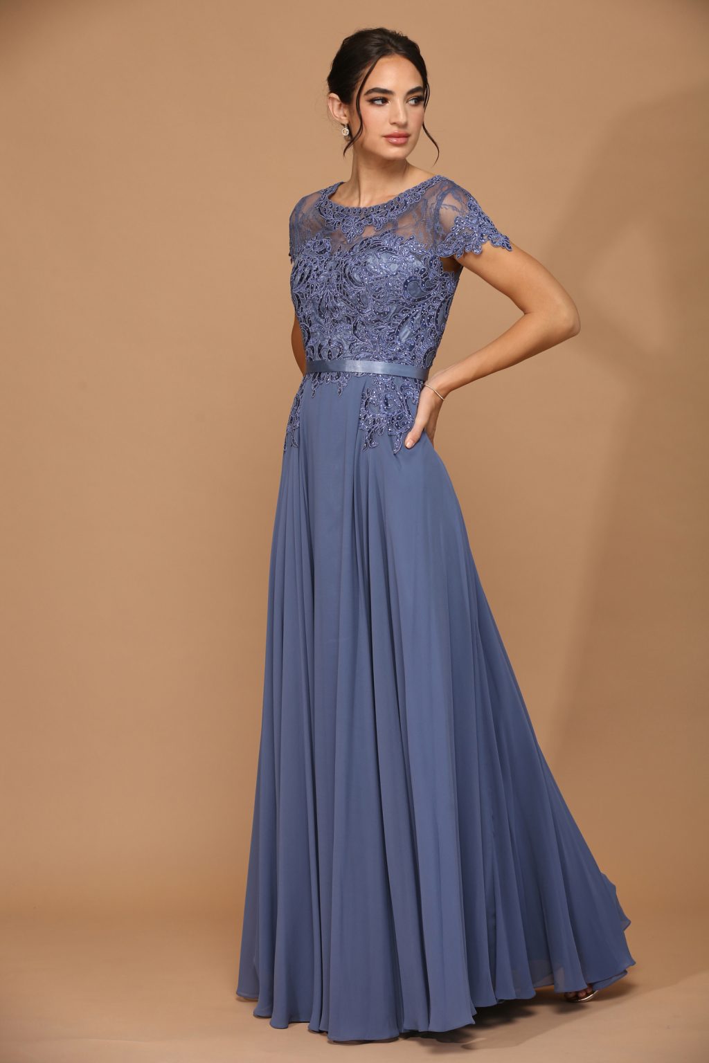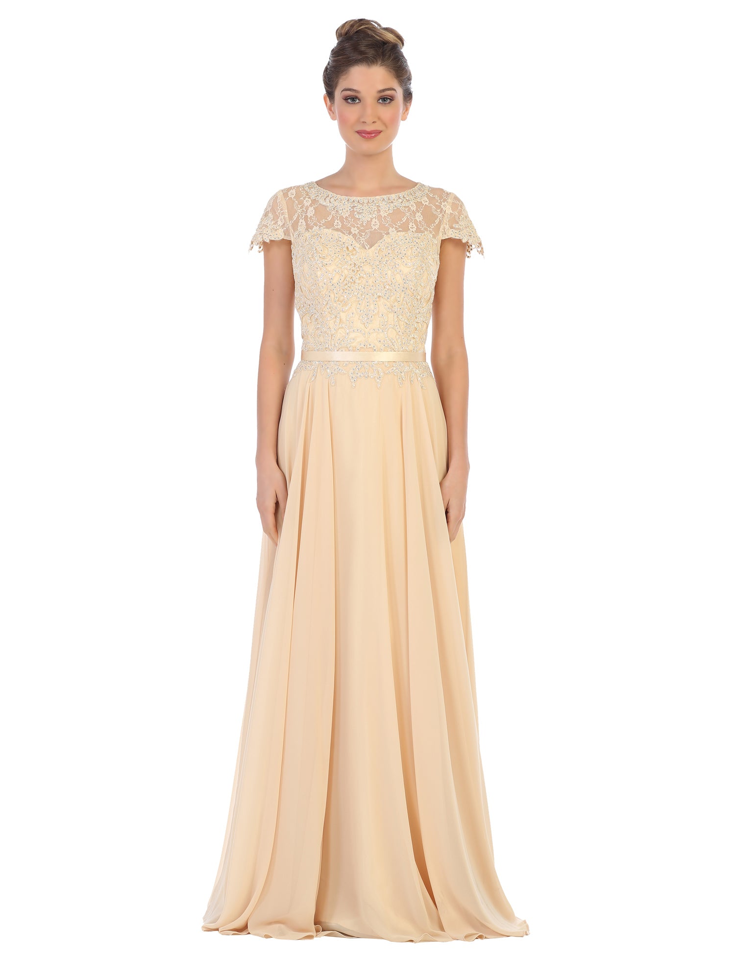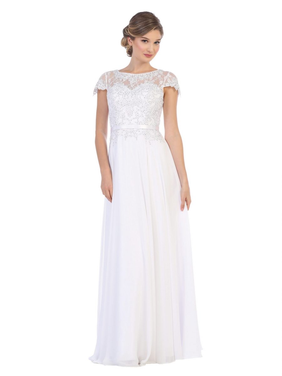 The Eva Evening Gowns 5130 is a sophisticated A-line formal dress designed to make a lasting impression. It features a beautifully crafted lace bodice adorned with delicate rhinestone detailing, adding a touch of elegance and sparkle. The gown includes short capped sleeves and a classic crew neckline, offering a modest yet refined look. Mesh panels provide subtle dimension, while a ribbon waistband enhances the silhouette by accentuating the waistline. The flowing chiffon skirt adds graceful movement, and the dress is fully lined for comfort, with a secure back zipper closure.