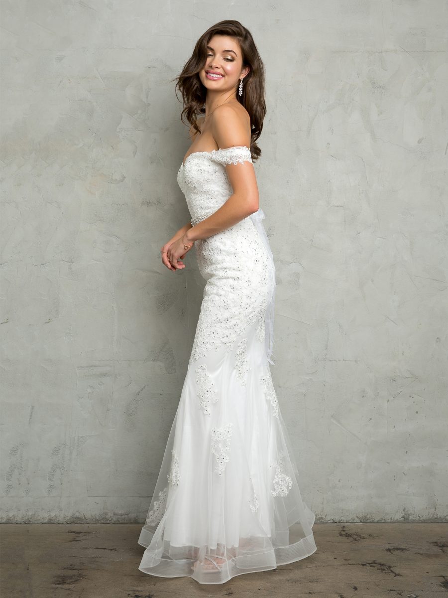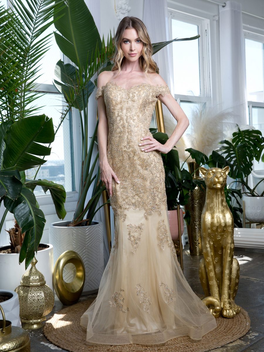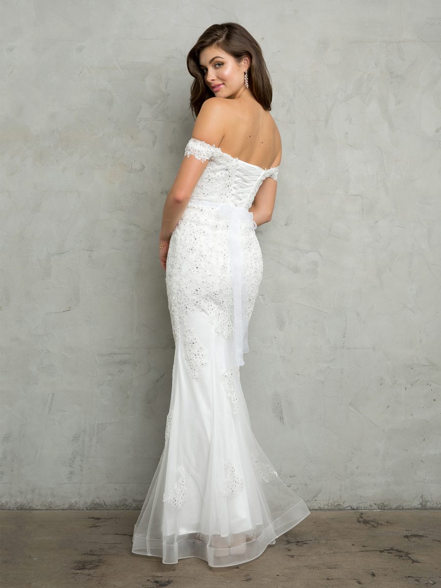 Eva Evening Gowns 5154 is a beautifully designed off-shoulder gown that blends romance and elegance. Crafted with delicate lace and layered tulle, the dress is adorned with intricate embellished appliqués that add a touch of glamour. The structured bodice features a corset-style back with a half zipper for both adjustability and a secure fit. An elastic band in the shoulder strap ensures comfort and flexibility. Fully lined for a smooth finish, this gown is perfect for formal events, weddings, and special occasions.