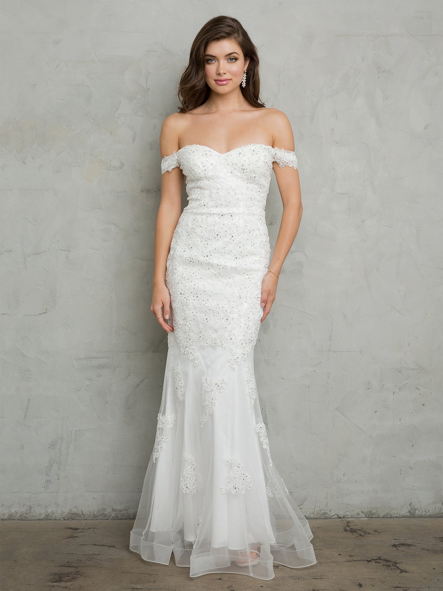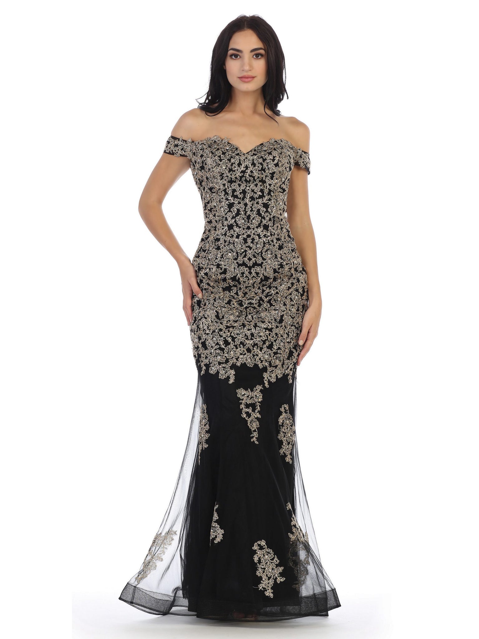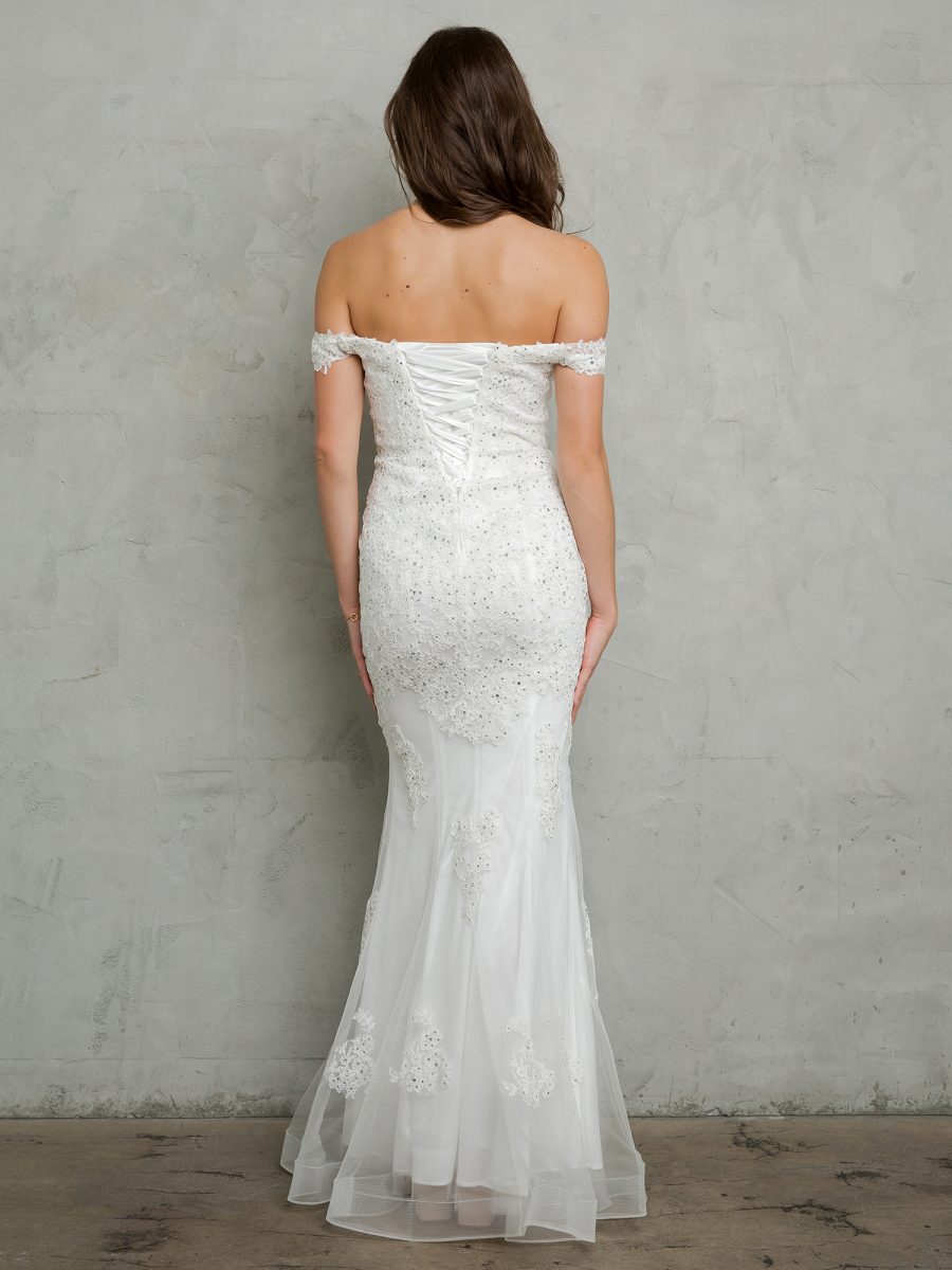 Eva Evening Gowns 5154 is a beautifully designed off-shoulder gown that blends romance and elegance. Crafted with delicate lace and layered tulle, the dress is adorned with intricate embellished appliqués that add a touch of glamour. The structured bodice features a corset-style back with a half zipper for both adjustability and a secure fit. An elastic band in the shoulder strap ensures comfort and flexibility. Fully lined for a smooth finish, this gown is perfect for formal events, weddings, and special occasions.