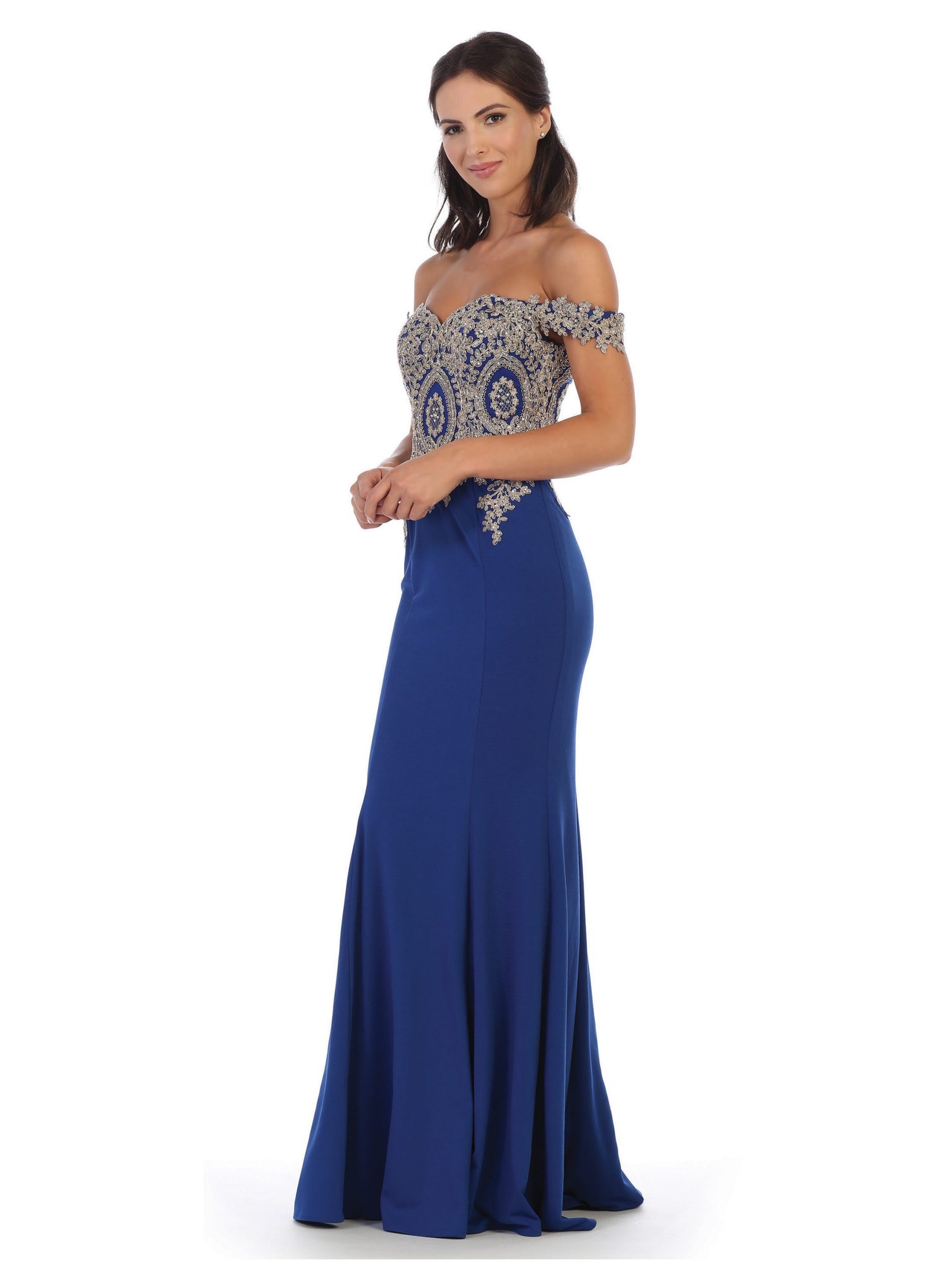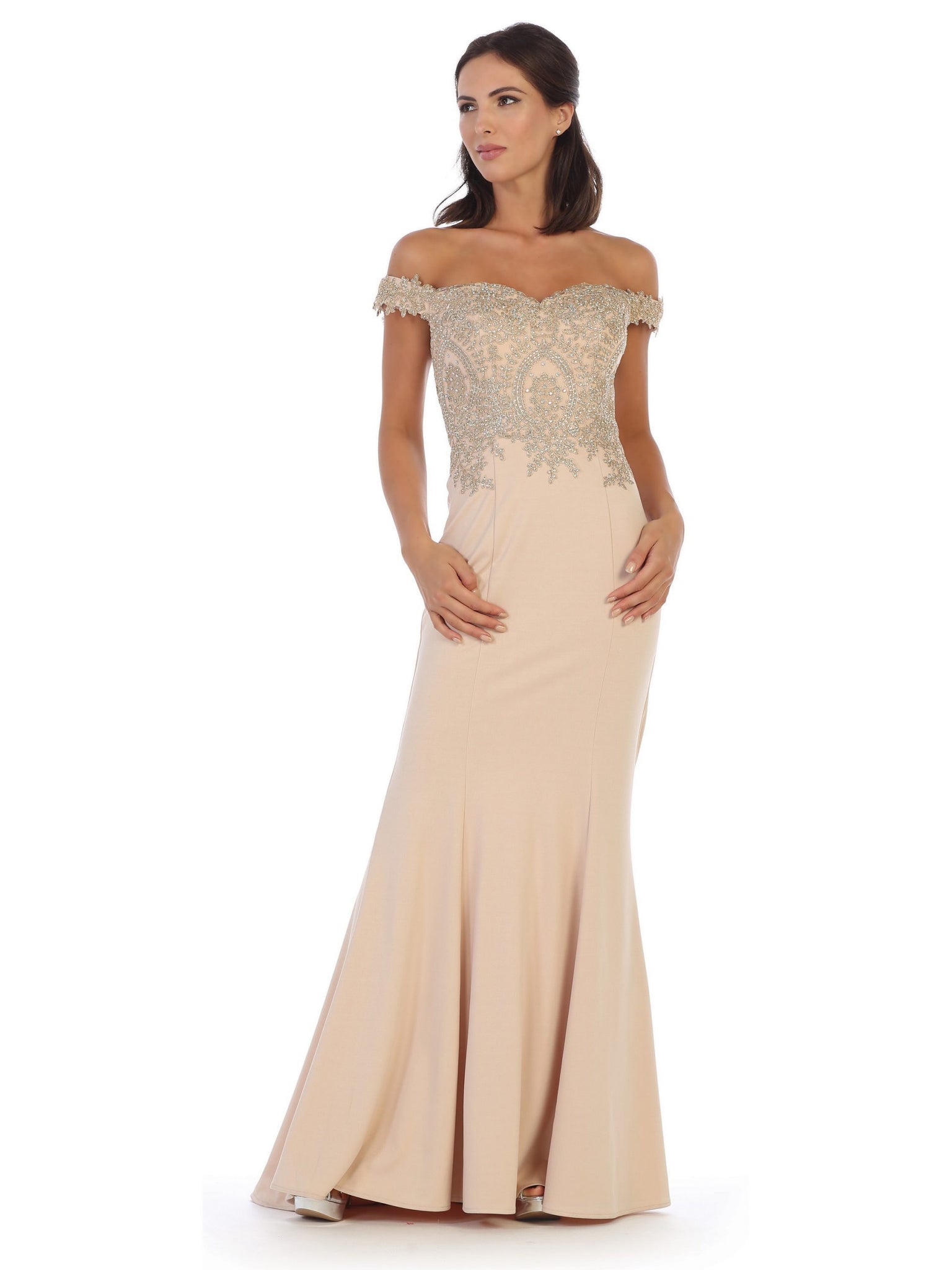 Eva Evening Gowns 5193 is a sophisticated off-shoulder gown crafted from stretch knit fabric that offers both elegance and comfort. The bodice is adorned with beautifully embroidered details, adding a refined and graceful touch. This gown is fully lined and includes built-in bra cups for support, along with a convenient back zipper for easy wear. A slight tail at the hem enhances the overall elegance, making it ideal for formal occasions, galas, or special events.