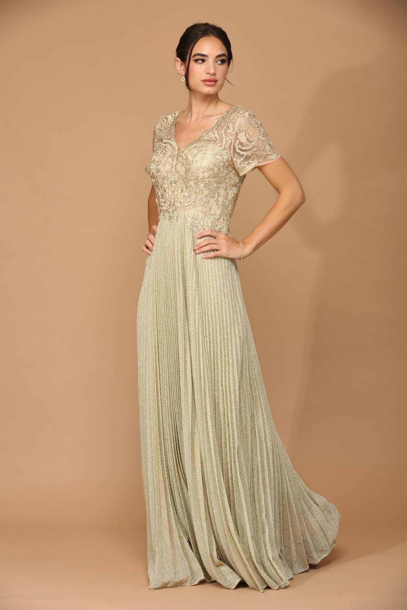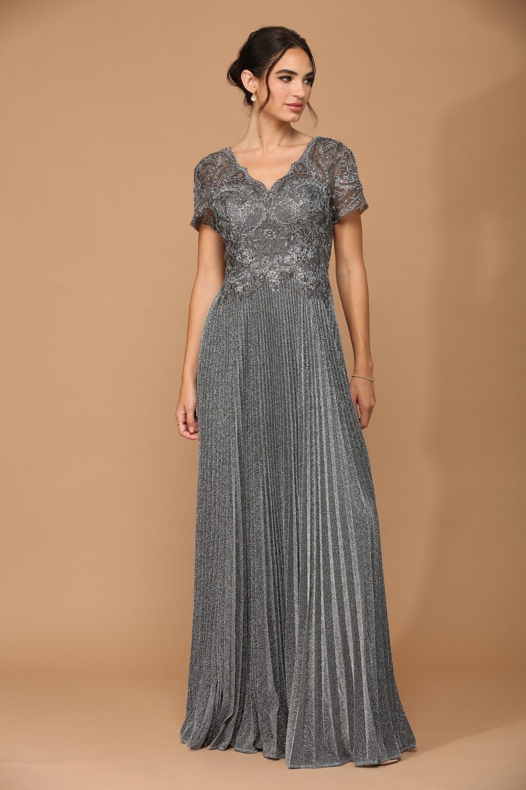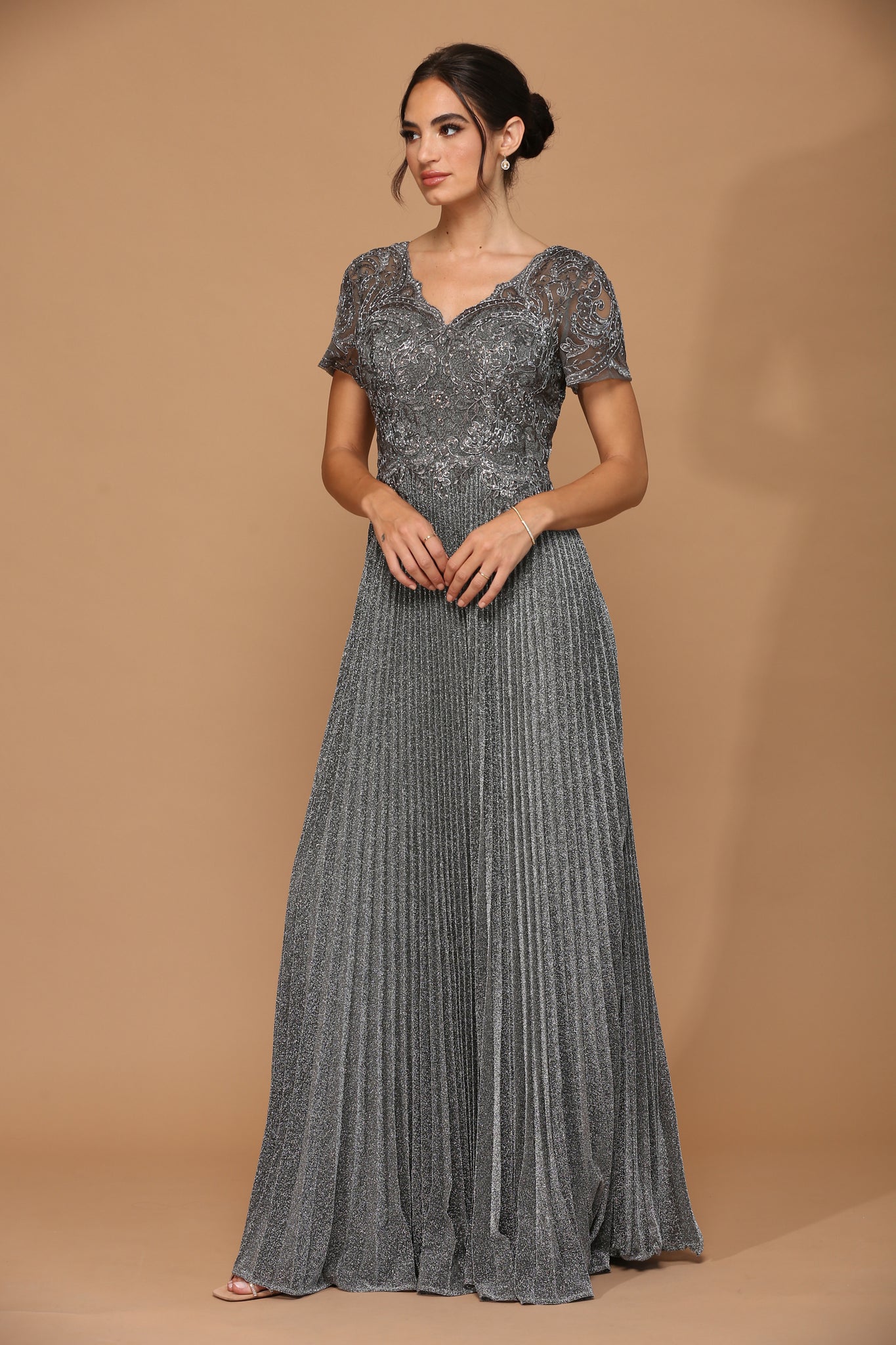 Eva Evening Gowns 5241 This elegant gown features a beautifully pleated A-line skirt crafted from a metallic woven fabric that flows gracefully with every step. The bodice is adorned with intricate metallic embroidery and sparkling rhinestone accents, adding a touch of glamour to the sophisticated design. Fully lined for comfort and structure, it is completed with a discreet back zipper for a seamless finish.