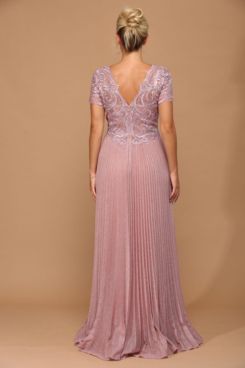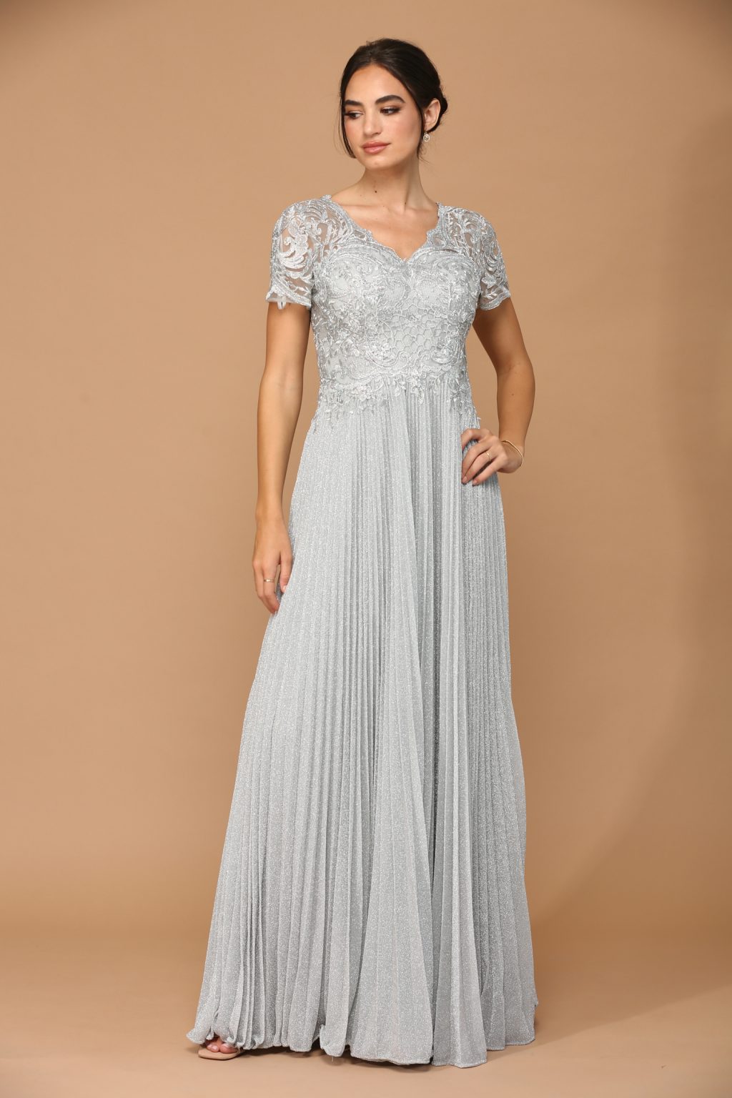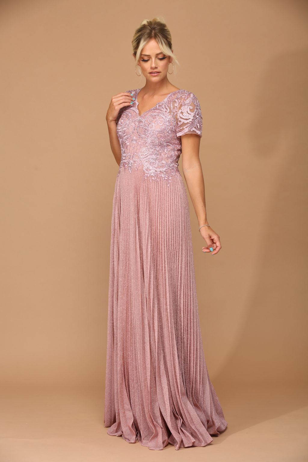 Eva Evening Gowns 5241 This elegant gown features a beautifully pleated A-line skirt crafted from a metallic woven fabric that flows gracefully with every step. The bodice is adorned with intricate metallic embroidery and sparkling rhinestone accents, adding a touch of glamour to the sophisticated design. Fully lined for comfort and structure, it is completed with a discreet back zipper for a seamless finish.