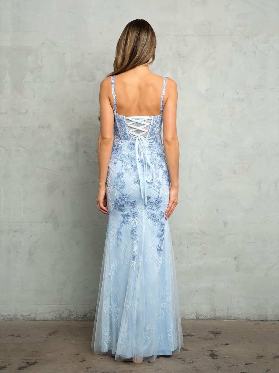 Eva Evening Gowns 5259 is a sophisticated and eye-catching evening gown designed to make a lasting impression. This style features an embellished lace bodice with corset boning for a sculpted, flattering silhouette. The front slit adds a touch of drama and allows for graceful movement, while the corset tie-back offers both adjustability and a romantic finish. Ideal for proms, galas, or formal events, this gown combines elegance with modern design elements.