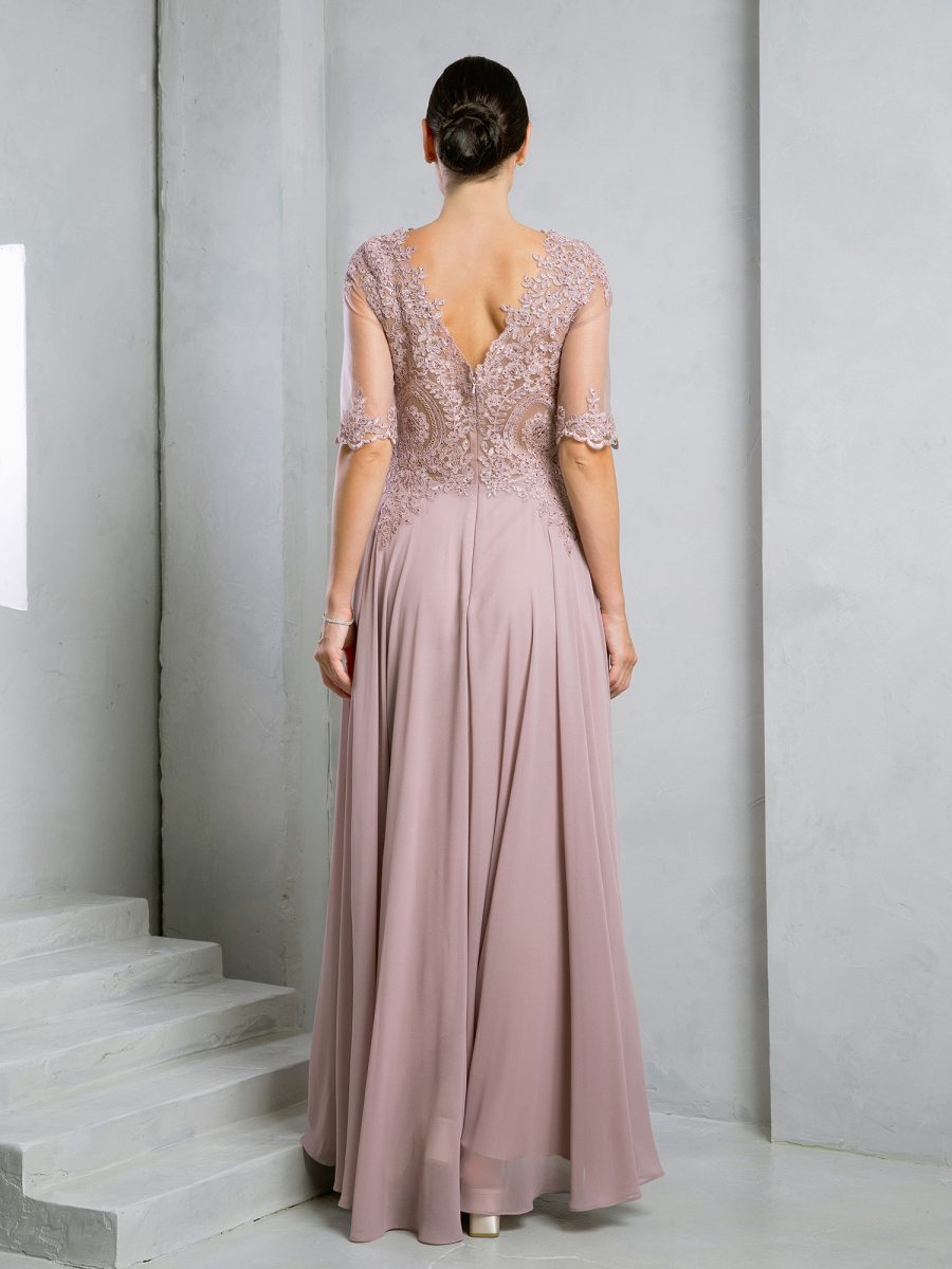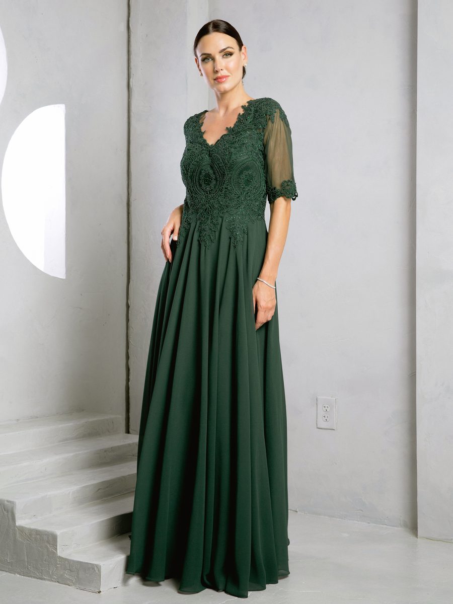 Eva Evening Gowns 5271 is a refined and elegant choice for the mother of the bride or any formal event. This chiffon gown features graceful half sleeves and a beautifully embellished bodice that showcases intricate embroidery with subtle stone detailing. The dress is fully lined for comfort and support, with built-in bra cups for a secure fit. A back zipper ensures ease of wear while maintaining a smooth and polished silhouette.