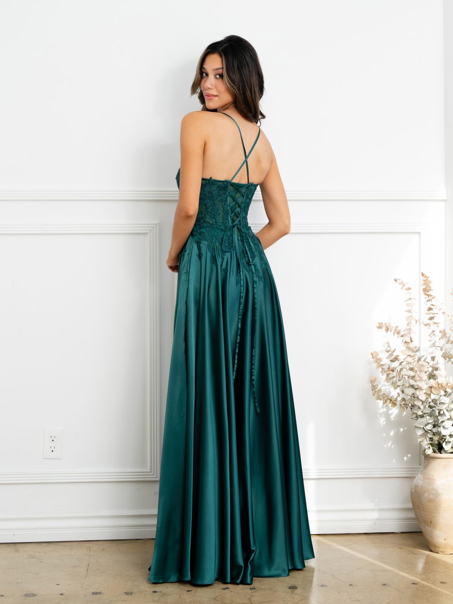 Eva Evening Gowns 5289 is a refined satin A-line gown that blends timeless elegance with contemporary detail. The bodice features intricate lace appliqués adorned with monochrome rhinestones and a graceful scoop neckline. Straps cross in the back, creating a corset-inspired design that enhances the silhouette. This gown includes built-in bra cups for comfort and support, a fully lined interior, convenient pockets, and a full flowing skirt that adds volume and movement—perfect for formal events or special occasions.
