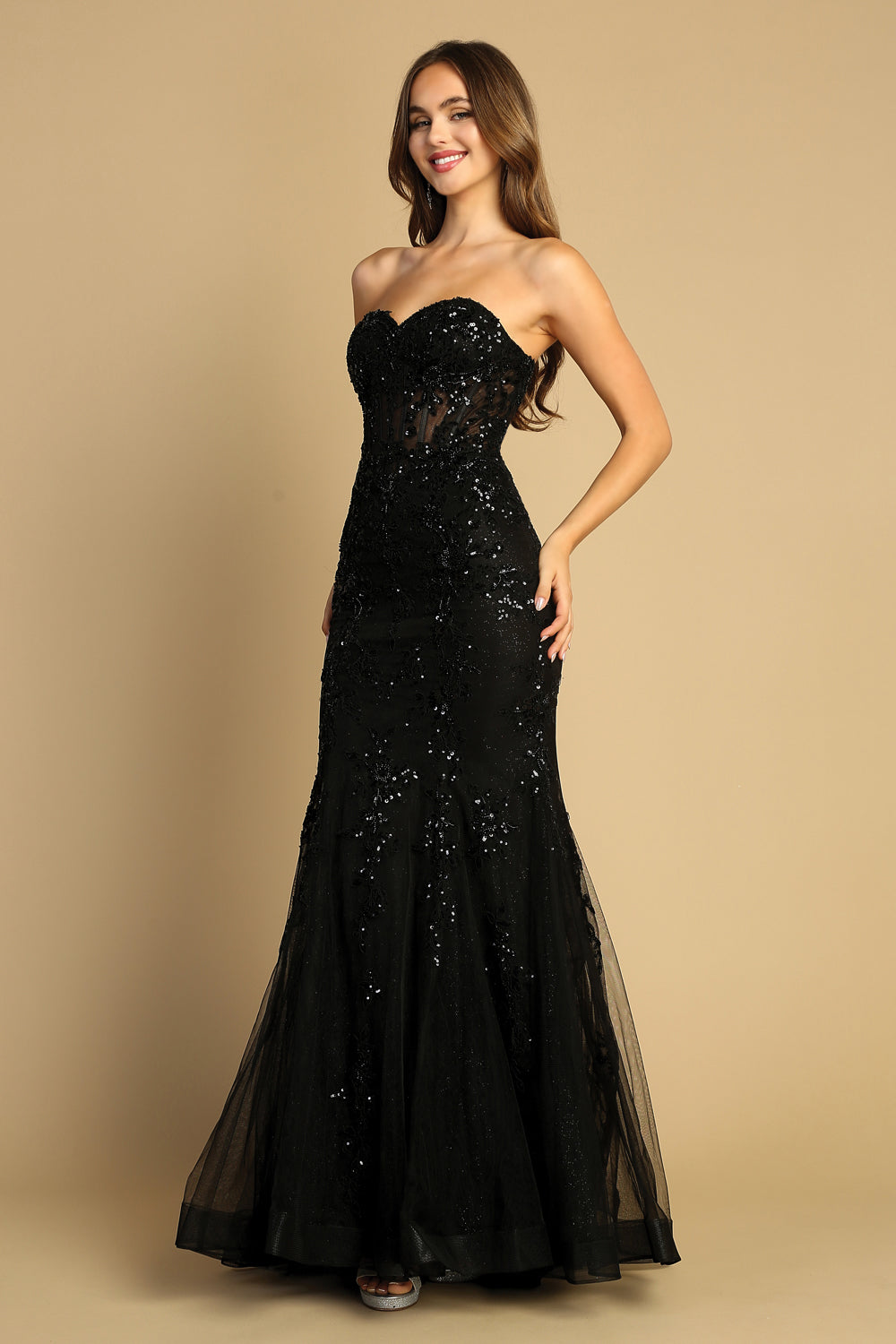 This gown is tailored to deliver a dramatic, elegant presence at formal events. Featuring a strapless, corset-style bodice adorned with intricate embroidered lace appliqués and beadwork, the dress offers a sculpted, body-hugging fit that highlights the wearer’s silhouette. From the waist down, the gown transitions into a full-length mermaid skirt that flares gracefully, creating a refined hourglass profile while allowing ease of movement. The structure of the dress provides both support and polish, blending sophistication with a classic, timeless evening wear design. Ideal for proms, galas, formal dinners, or any black-tie occasion where glamour and poise matter.