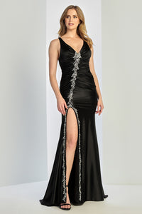 Turn heads in the captivating Adora Evening Gown style 3248. This sleek, form-fitting gown in a luxurious red satin finish features a flattering V-neckline and sleeveless design, perfect for showcasing your shoulders and décolletage. A stunning line of rhinestone floral embellishments cascades down the bodice and follows the thigh-high slit, adding the perfect touch of sparkle and elongating the silhouette. The gathered ruching at the waistline enhances your shape, making this gown ideal for proms, galas, and formal evening events.