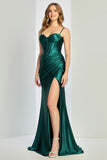 Make a striking statement in the Adora Evening Gown style 3256. Crafted from lustrous satin in a deep emerald hue, this stunning gown features a structured corset bodice with underwire cups for a figure-flattering silhouette. Thin spaghetti straps add a delicate touch, while the ruched detailing around the waist enhances curves and creates an effortlessly elegant shape. A dramatic thigh-high slit adds just the right amount of allure, perfect for prom, formal events, or pageants. The lace-up back ensures a customizable fit, flowing gracefully into a floor-length skirt with a slight train that glides beautifully as you walk.