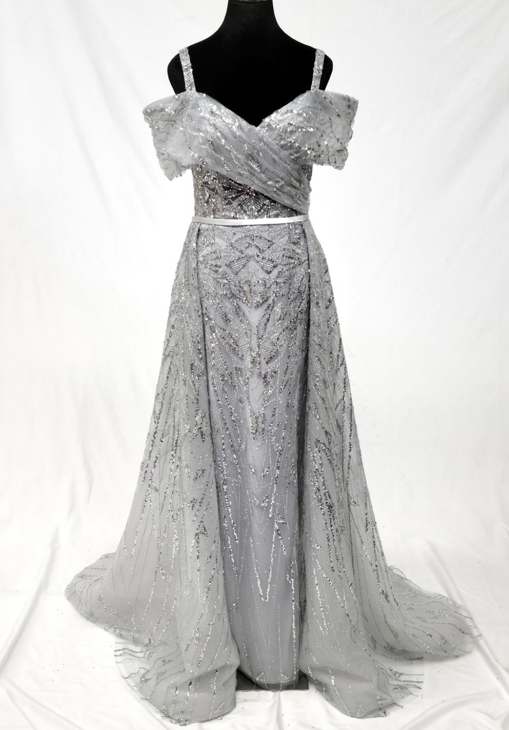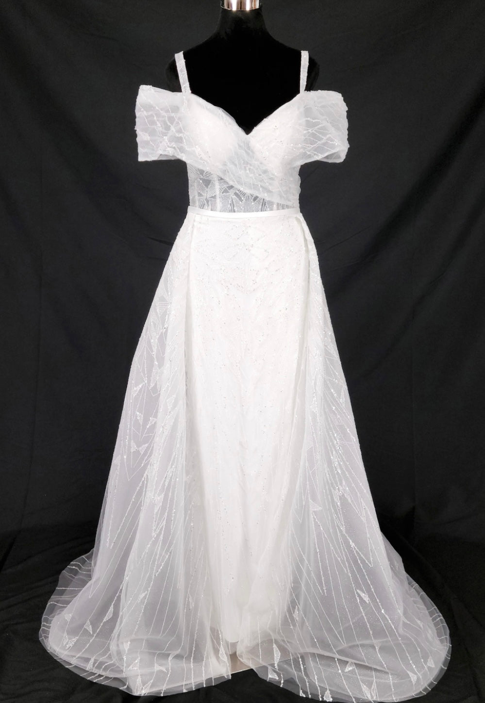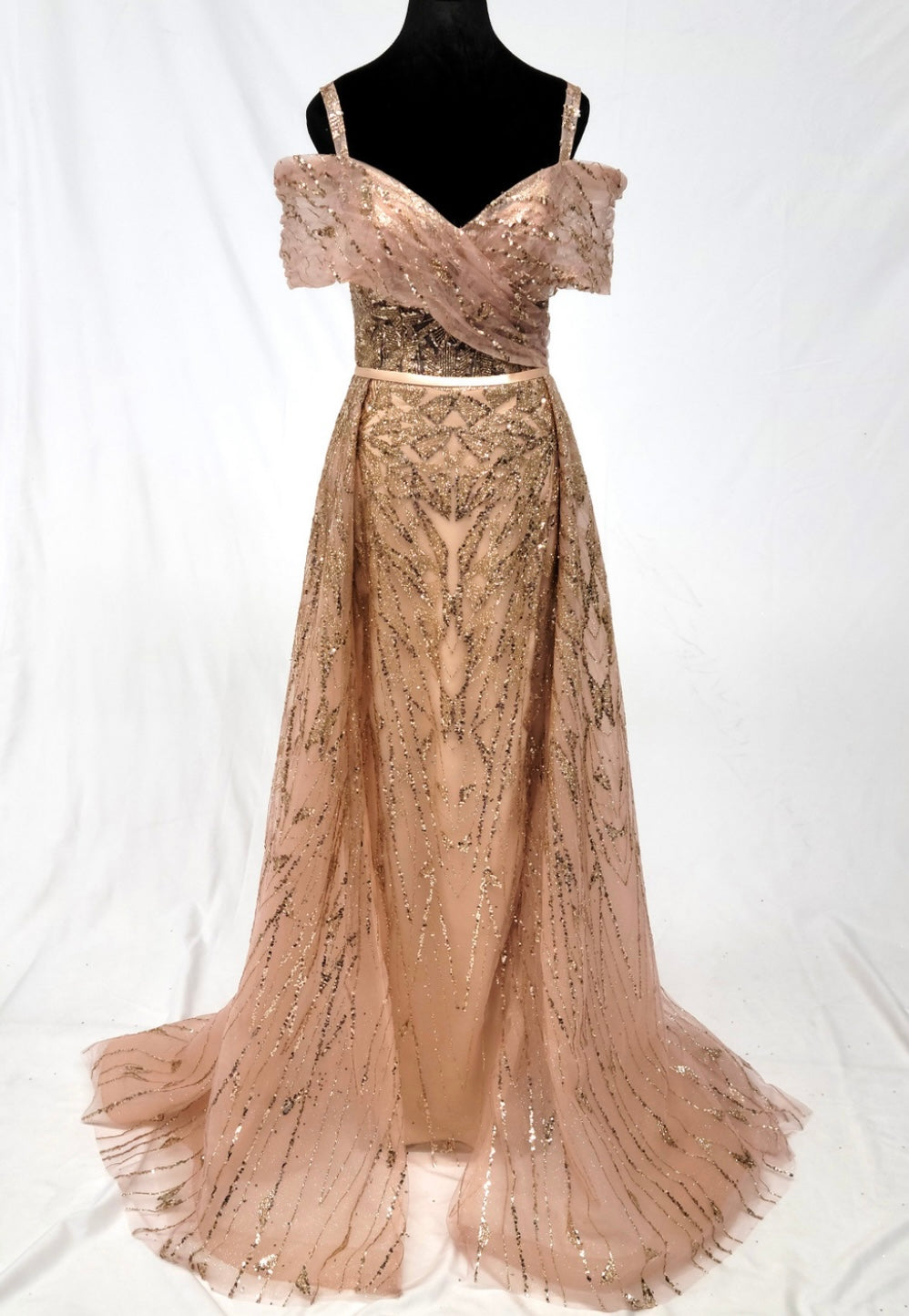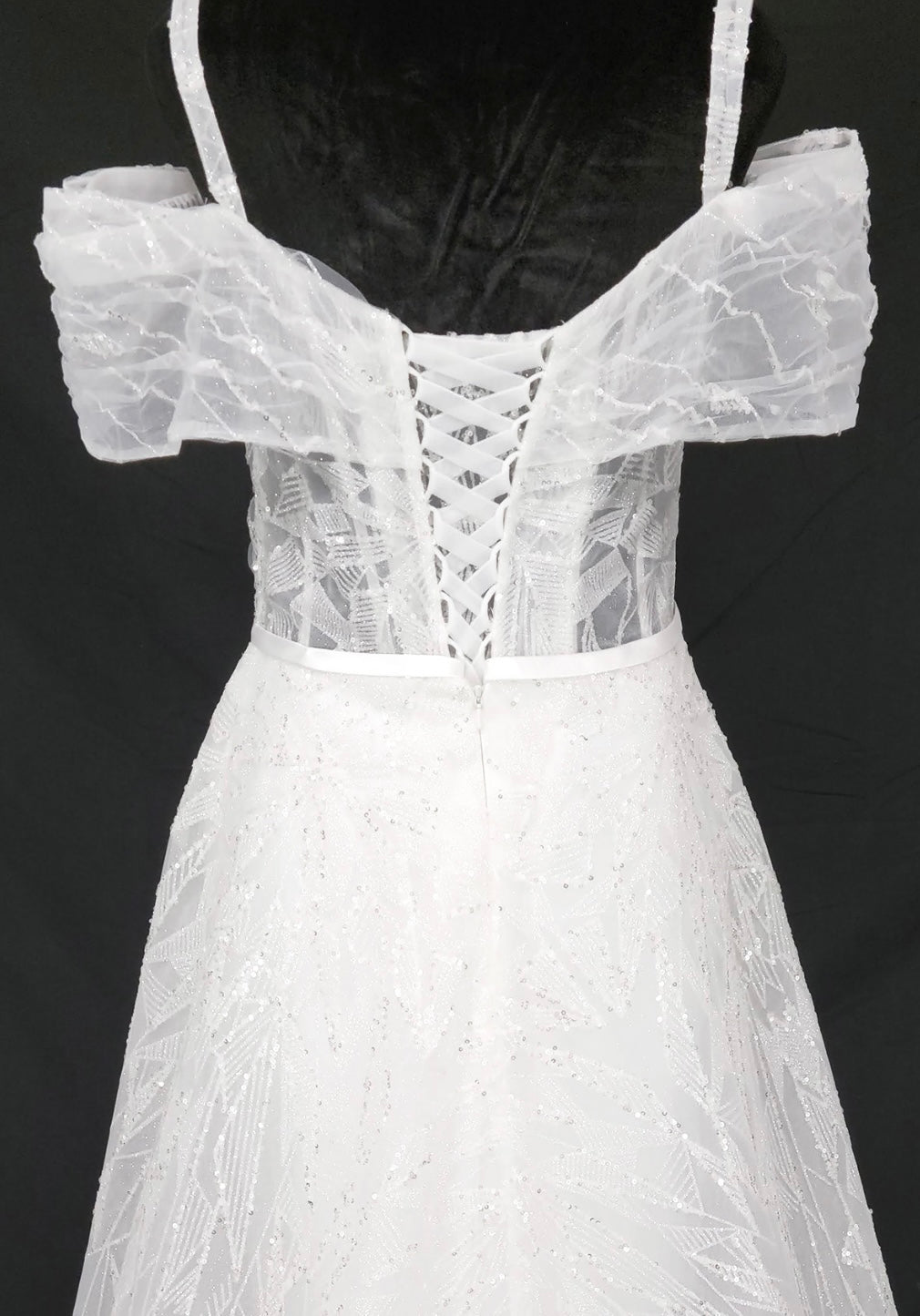 Step into elegance with this enchanting evening gown by Chicas, style 17990. Featuring delicate off-the-shoulder sleeves with thin straps and a sweetheart neckline, the bodice is beautifully draped and adorned with intricate glitter patterns. The A-line silhouette is accentuated by a thin satin waistband, while the shimmering tulle overlay flows gracefully to the floor, creating a look of timeless sophistication. Designed by Chicas, this dress is a perfect choice for any formal event.