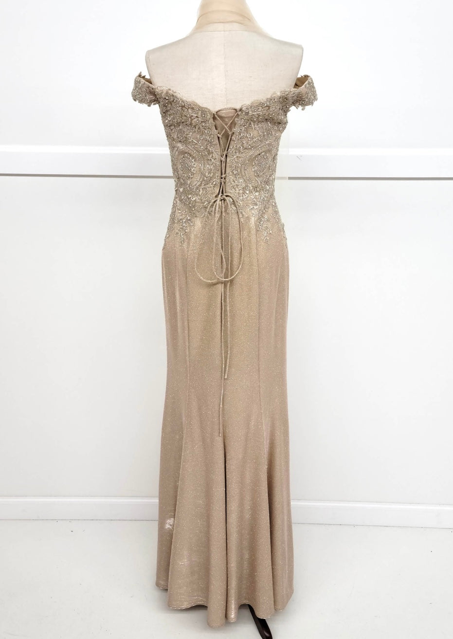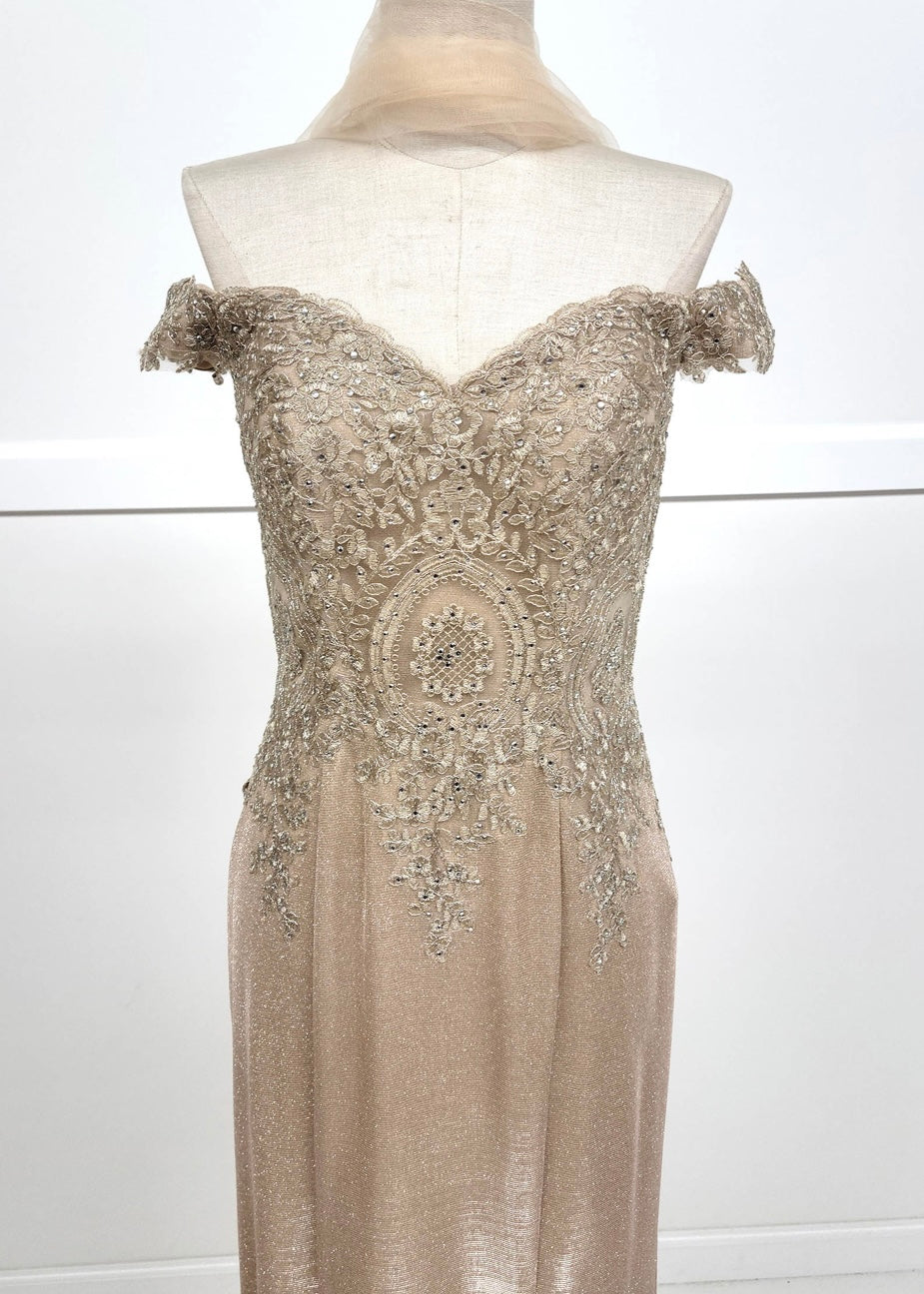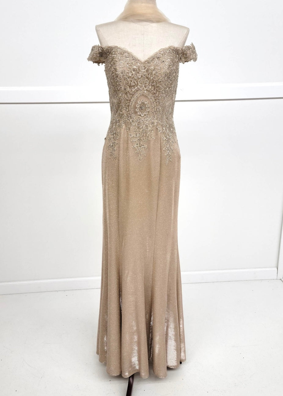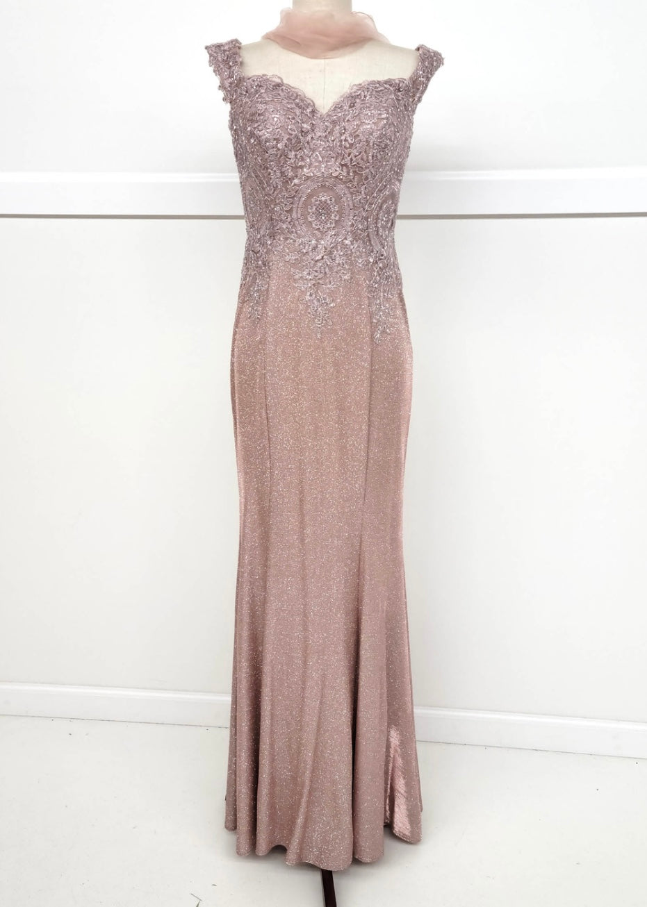 Chicas Design 4025 is an elegant and refined evening gown, perfect for mothers of the bride, formal galas, or special celebrations. This fitted design features a soft sweetheart neckline with wide straps and a beautifully embroidered bodice with intricate lace detailing and subtle sparkle. The glittery fabric flows into a graceful floor-length skirt that flatters the silhouette while maintaining comfort and sophistication. Available in rose and champagne, this gown blends classic style with modern shimmer.