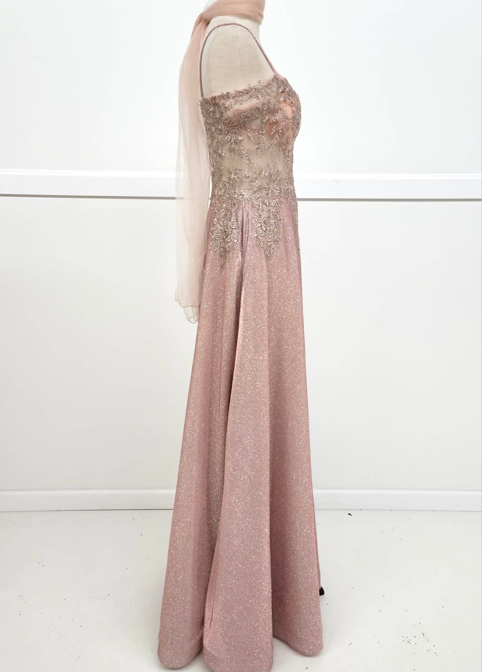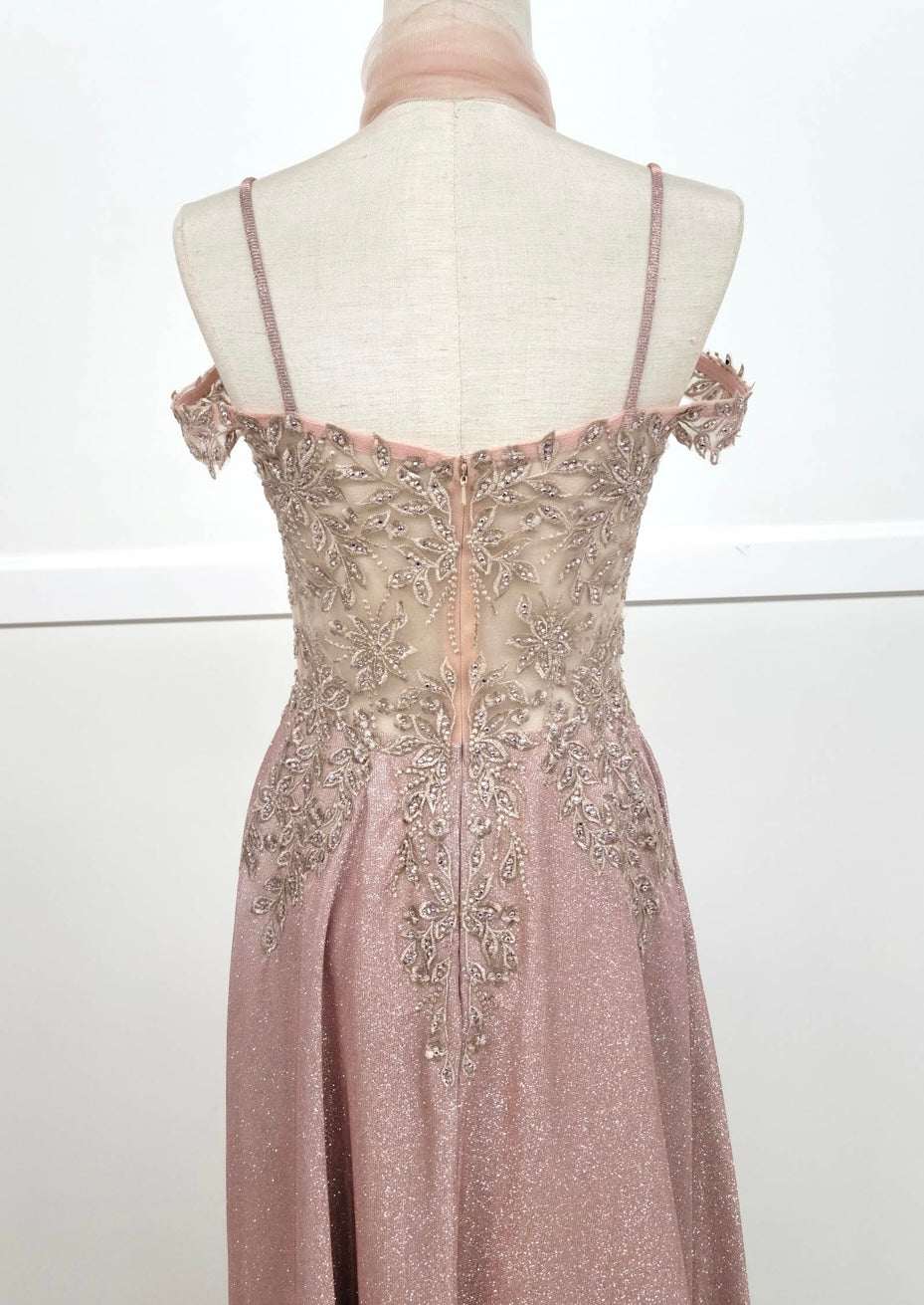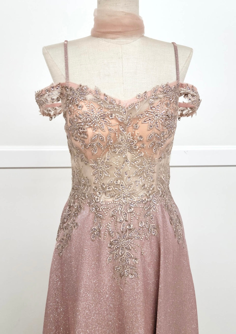 Graceful and timeless, this A-line gown by Chicas, style 4031, features a delicate blend of shimmer and elegance. The dress showcases a sheer bodice with off-the-shoulder draped sleeves and dainty spaghetti straps. Intricate beadwork and floral embroidery highlight the bodice, flowing softly into a glittery full-length skirt that drapes beautifully with every step. Ideal for evening events, prom, or formal occasions, this gown is available in romantic rose and soft sage.