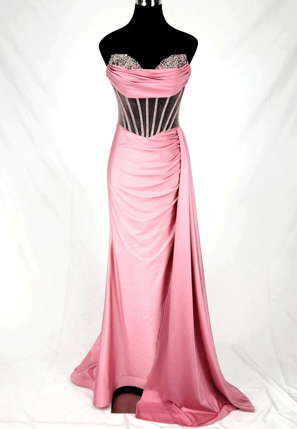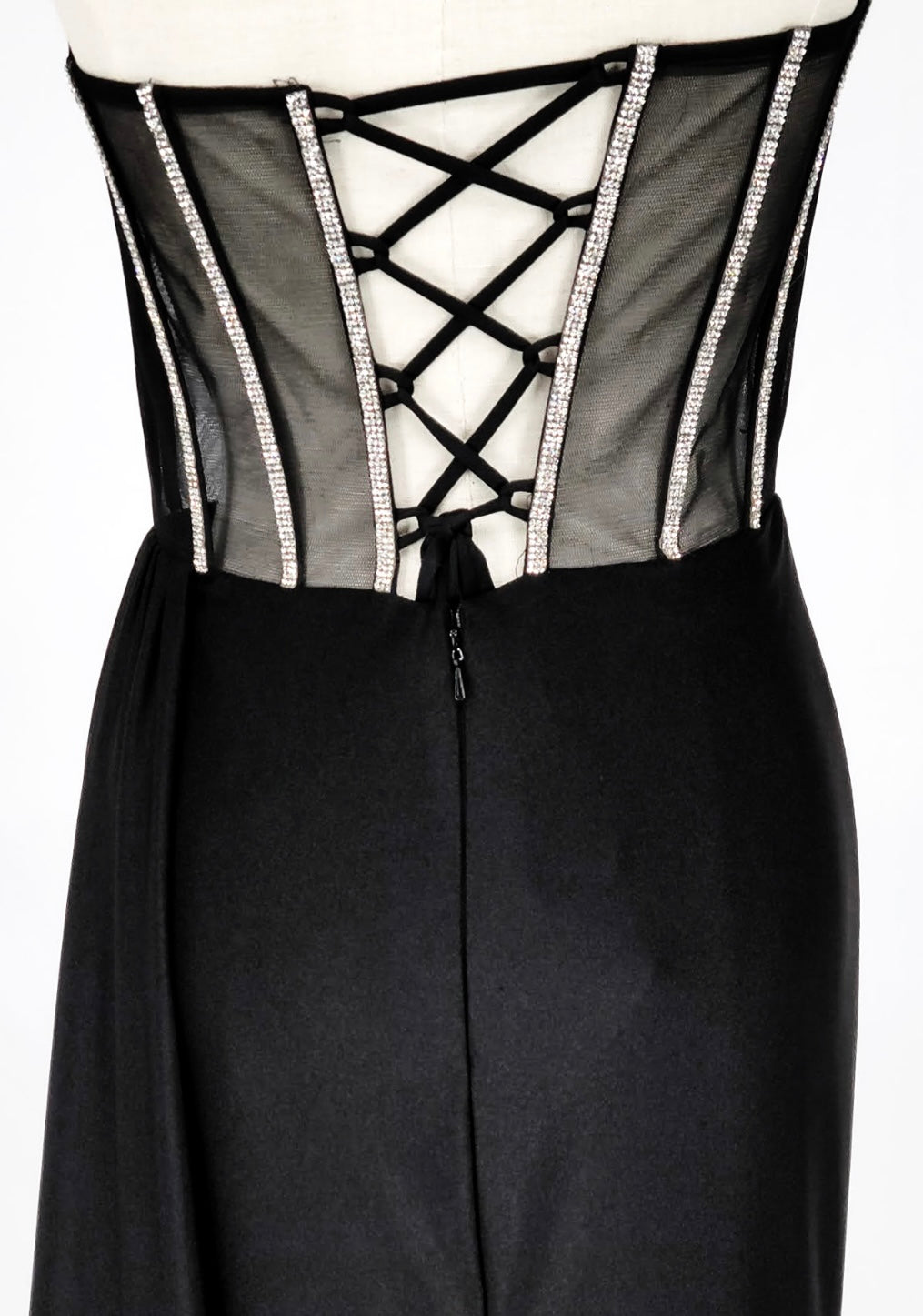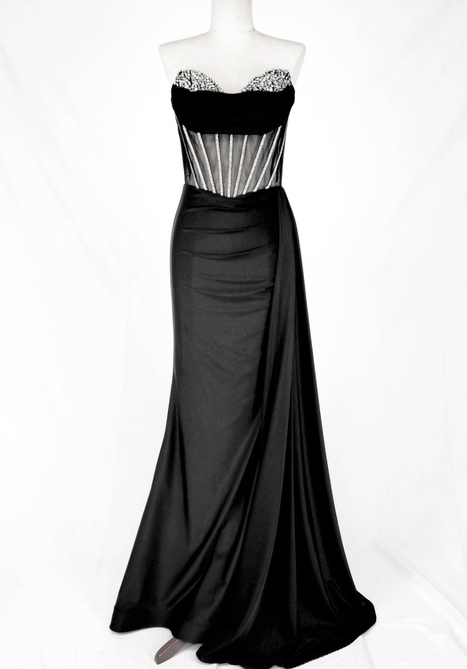 Command attention in this bold and elegant black evening gown by Chicas, style C367. This strapless design features a sweetheart neckline with sparkling crystal embellishments that highlight the bust. The sheer corset bodice is structured with vertical boning and dazzling rhinestone accents, adding a touch of allure and modern edge. The sleek satin skirt drapes gracefully with soft pleats and a side overlay, creating a sophisticated silhouette. Perfect for red carpet events, galas, or any occasion where glamour is a must.