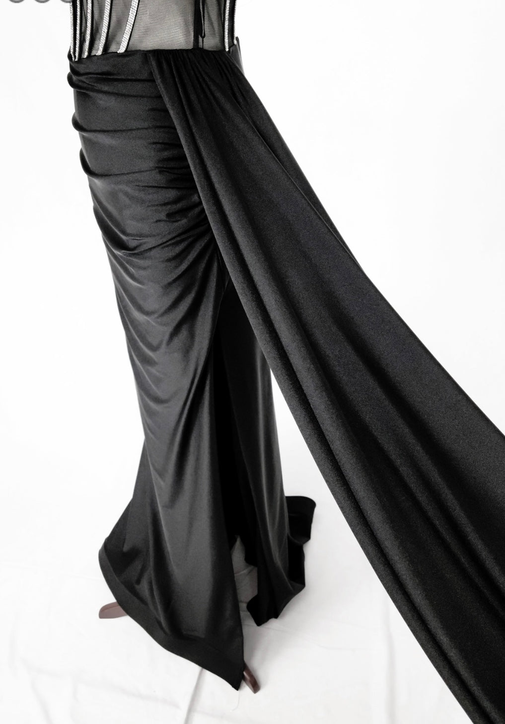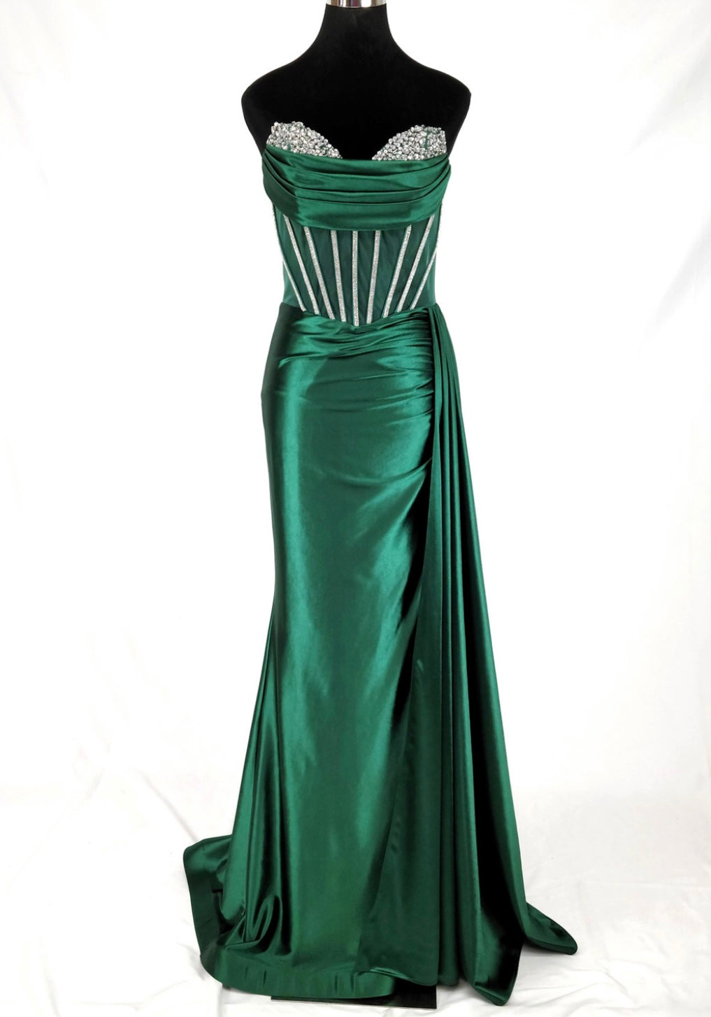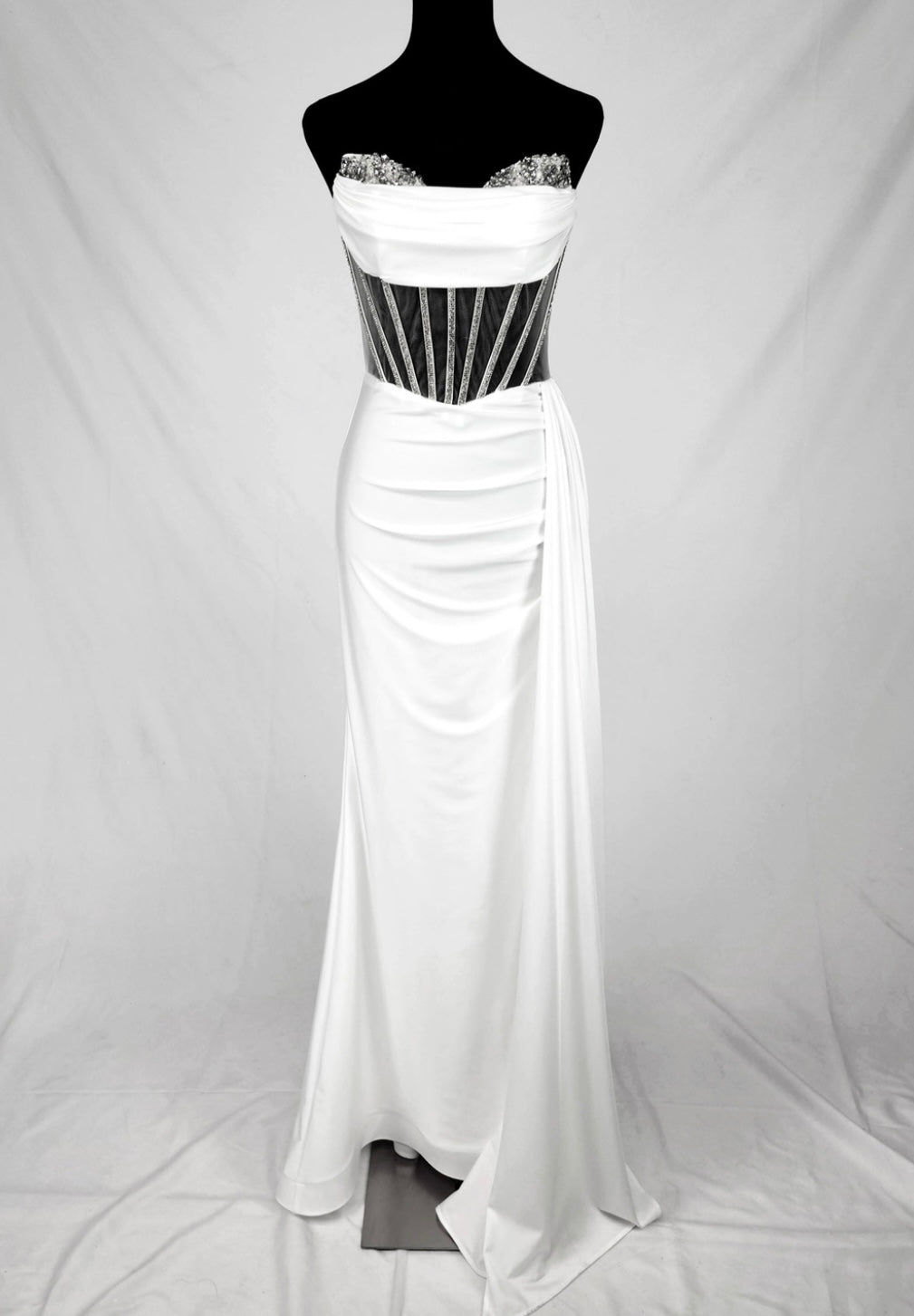 Command attention in this bold and elegant black evening gown by Chicas, style C367. This strapless design features a sweetheart neckline with sparkling crystal embellishments that highlight the bust. The sheer corset bodice is structured with vertical boning and dazzling rhinestone accents, adding a touch of allure and modern edge. The sleek satin skirt drapes gracefully with soft pleats and a side overlay, creating a sophisticated silhouette. Perfect for red carpet events, galas, or any occasion where glamour is a must.