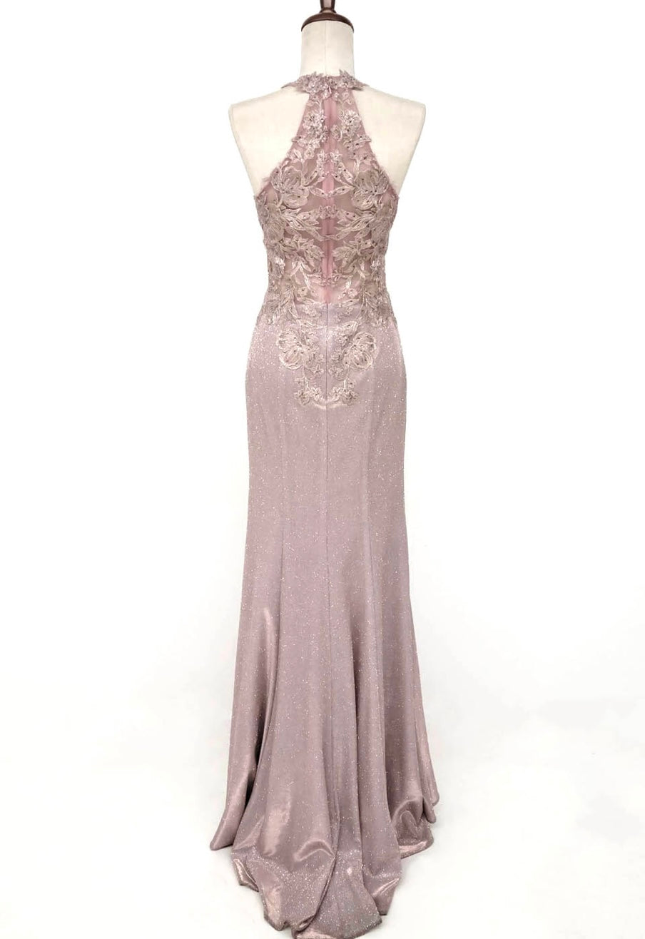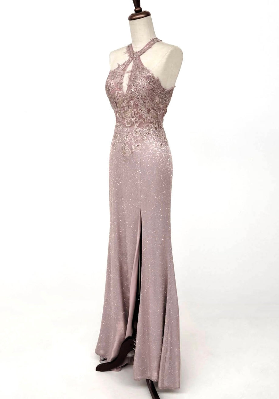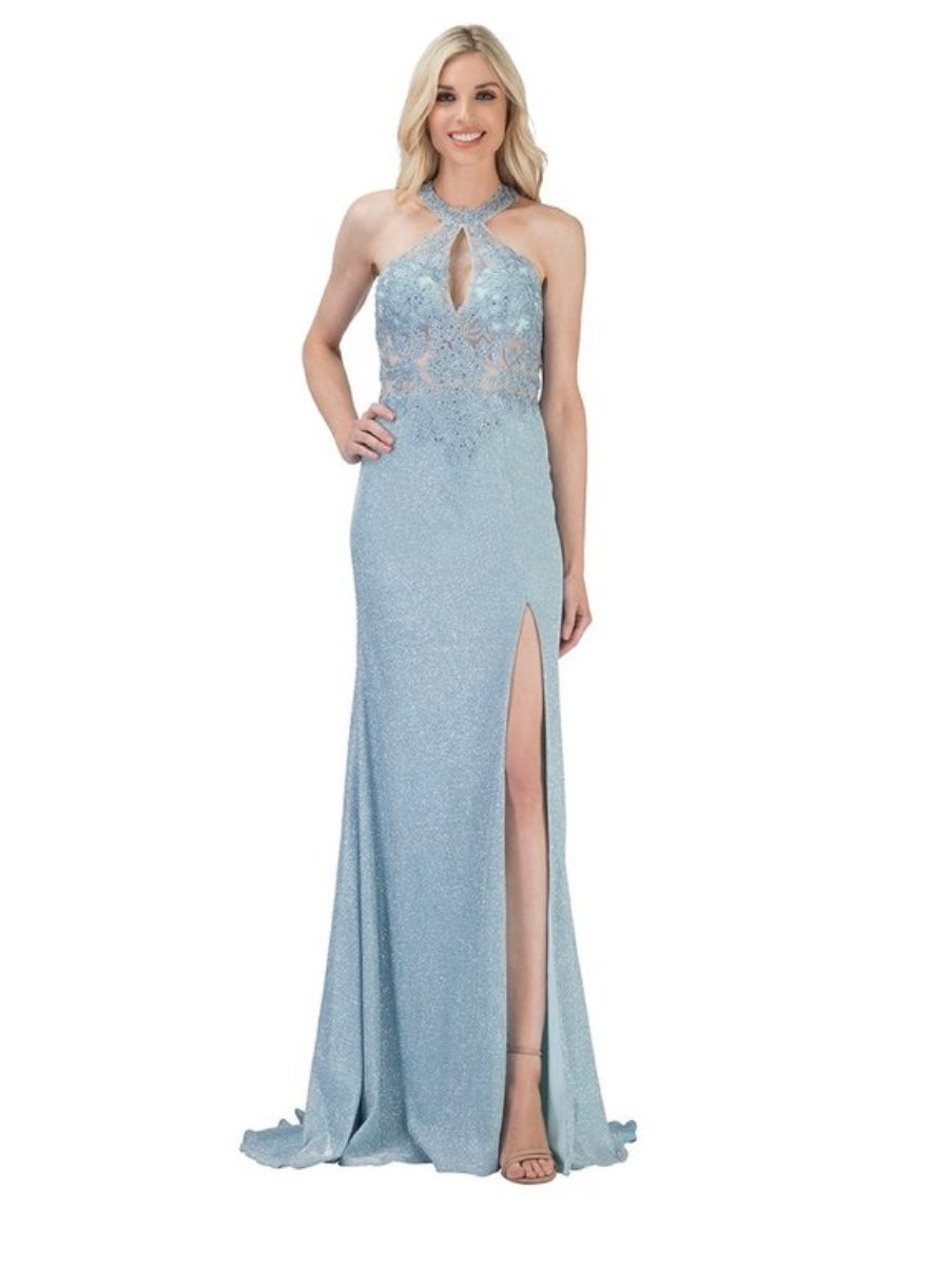This stunning evening gown by Chicas, style C7538, features a high halter neckline with a keyhole cutout and intricate floral lace appliqué on the bodice. Crafted in glittery stretch fabric, it hugs the silhouette and flows into a floor-length skirt with a thigh-high slit, offering both elegance and a hint of allure. Available in soft blush and icy blue tones, this gown is perfect for formal occasions and evening events.