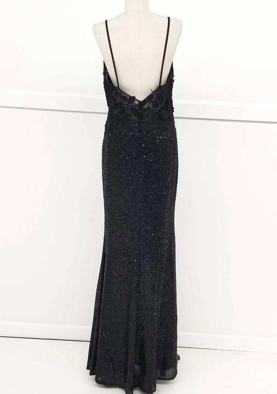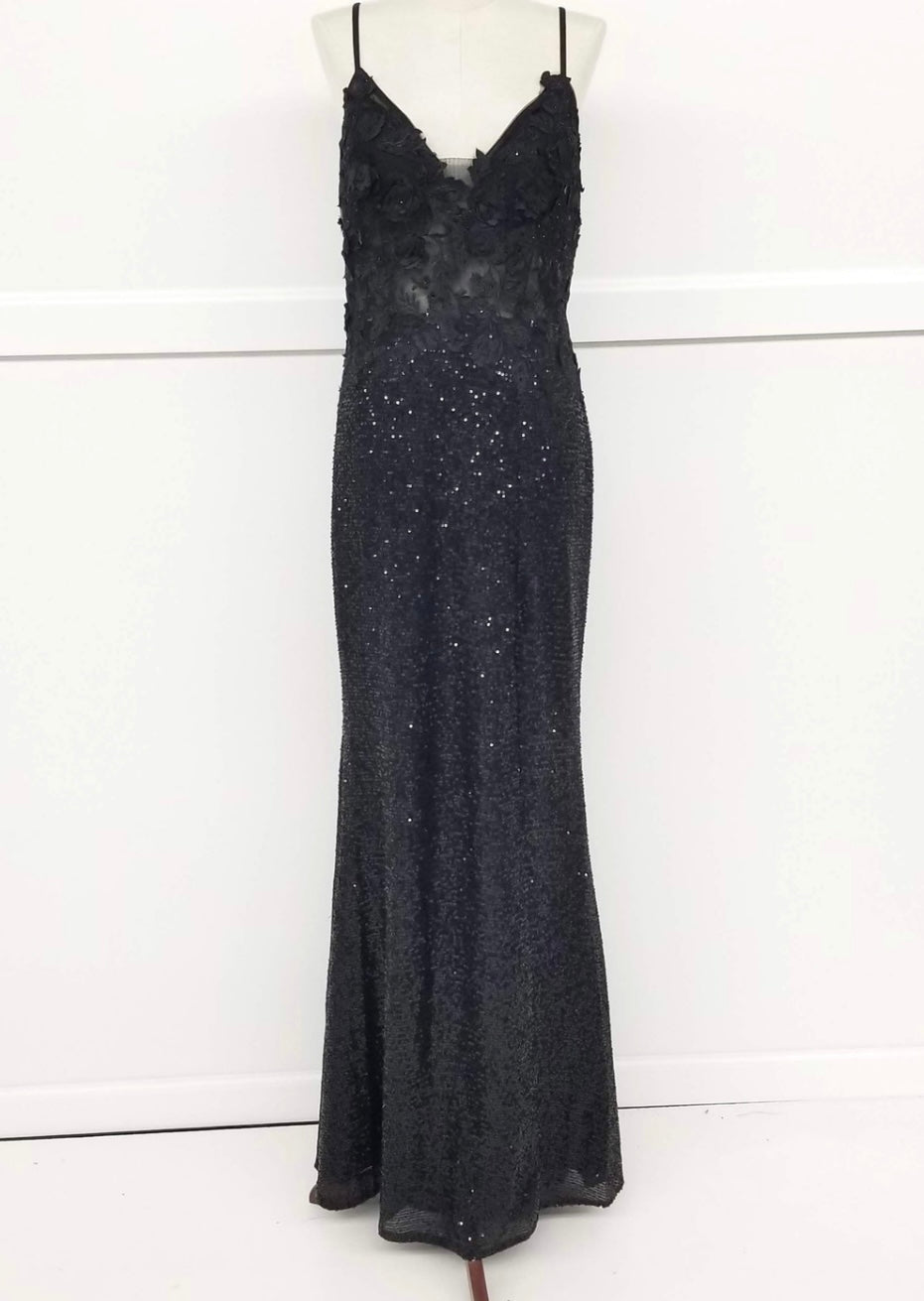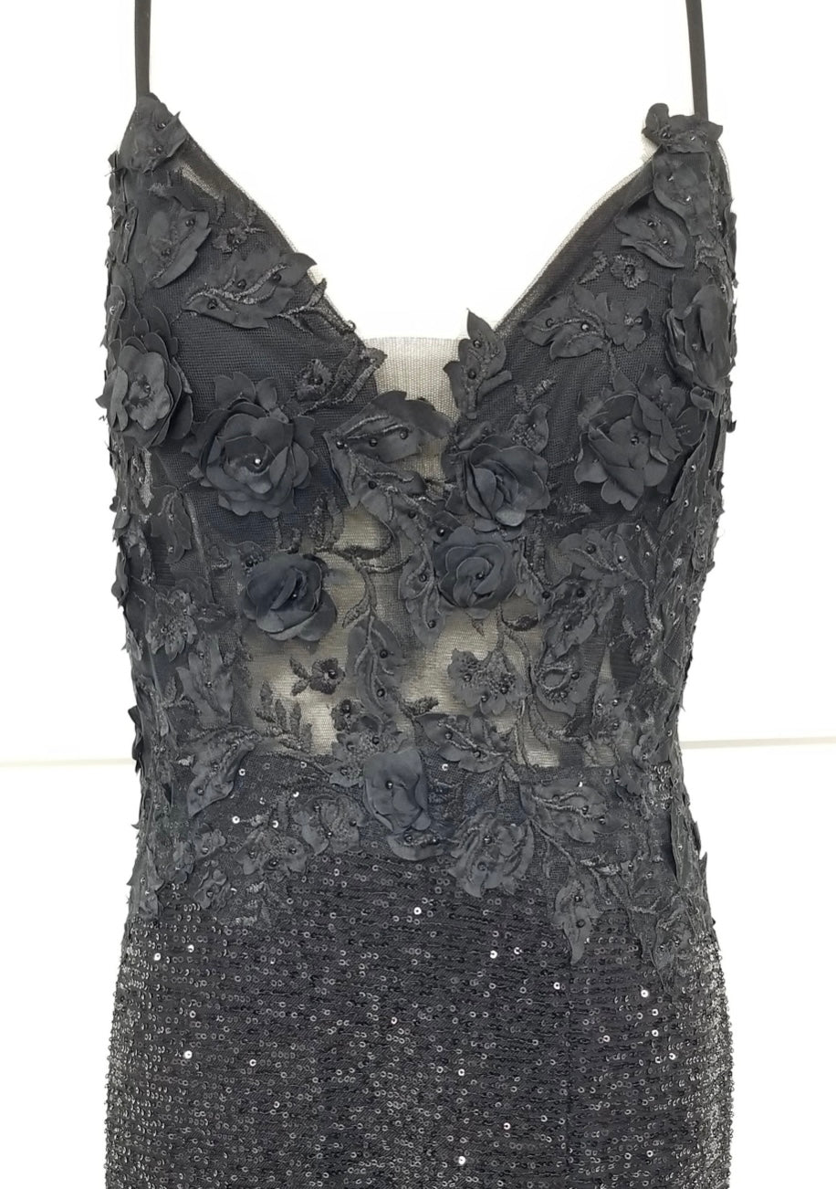 Make a dazzling entrance in this elegant evening gown from Chicas, style C803. This fitted silhouette features delicate spaghetti straps and a plunging neckline adorned with 3D floral appliqués that flow into a semi-sheer bodice. The entire dress is embellished with shimmering sequins, adding a glamorous sparkle with every step. A tasteful front slit enhances movement and allure. Available in Black, Royal Blue, and Gold.