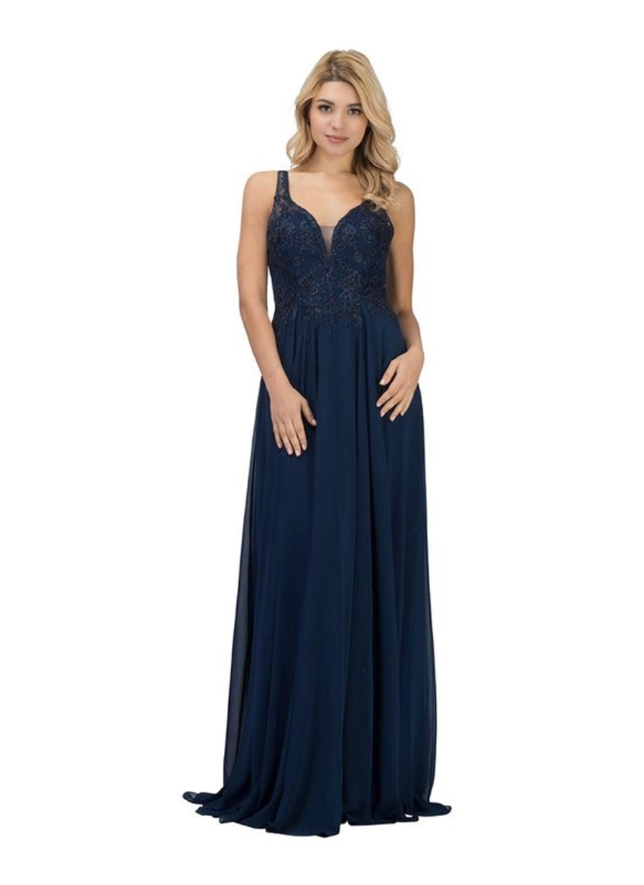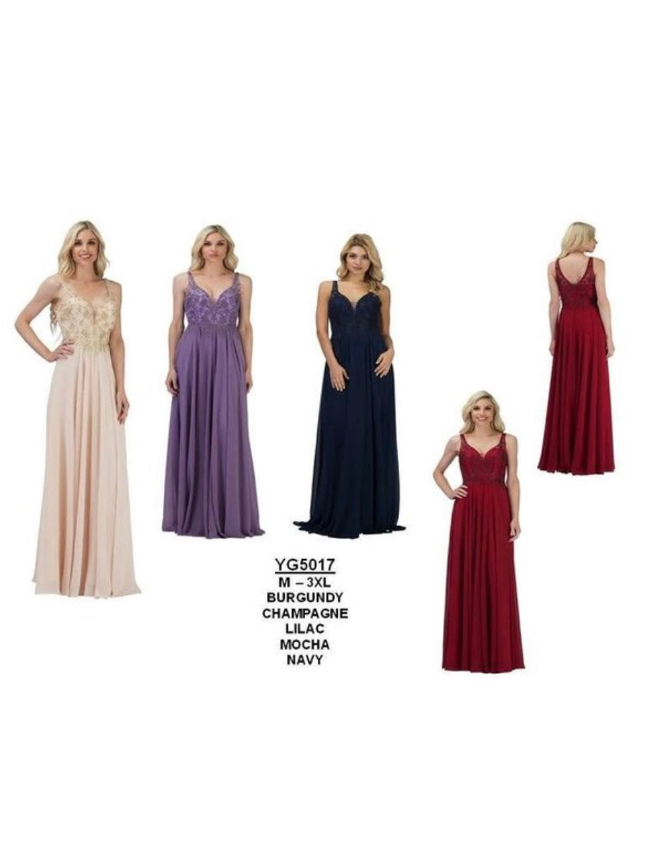 Radiate elegance in this long chiffon gown featuring a deep V neckline and wide straps. The fitted bodice is beautifully adorned with intricate lace appliqués and subtle beading, adding a touch of sparkle and sophistication. The flowing A-line skirt drapes gracefully, creating a soft and flattering silhouette. Available in stunning colors such as burgundy, lilac, champagne, navy, and mocha, this dress is perfect for bridesmaids, formal events, or evening occasions. Offered in sizes M to 3XL.
