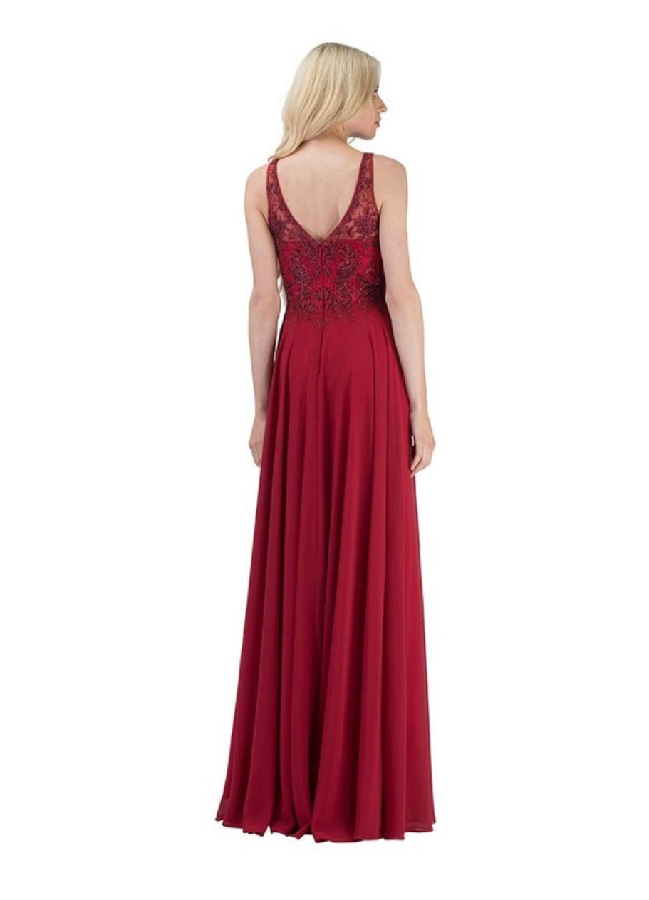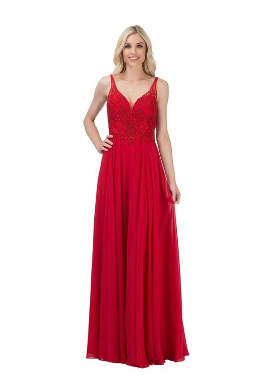Elegant and flowing, this floor-length A-line gown features a beautifully beaded lace bodice that highlights the plunging neckline with illusion inset. The delicate thin straps and soft chiffon skirt provide graceful movement and a flattering silhouette. Available in various rich colors, this gown is perfect for formal occasions, proms, or evening events.