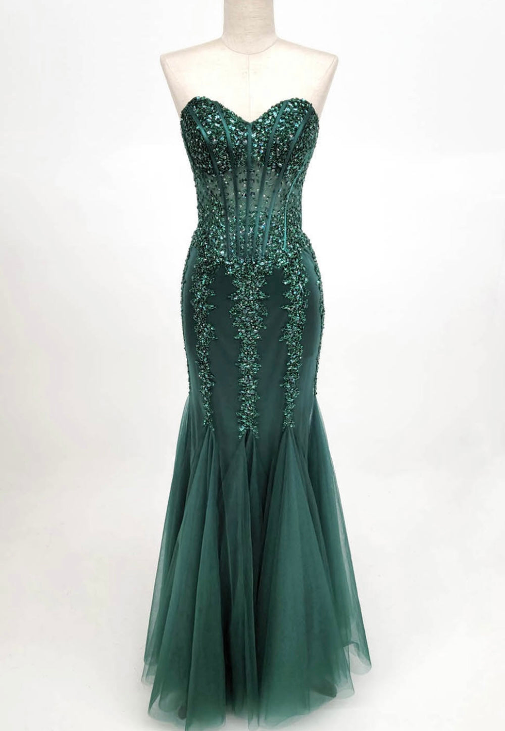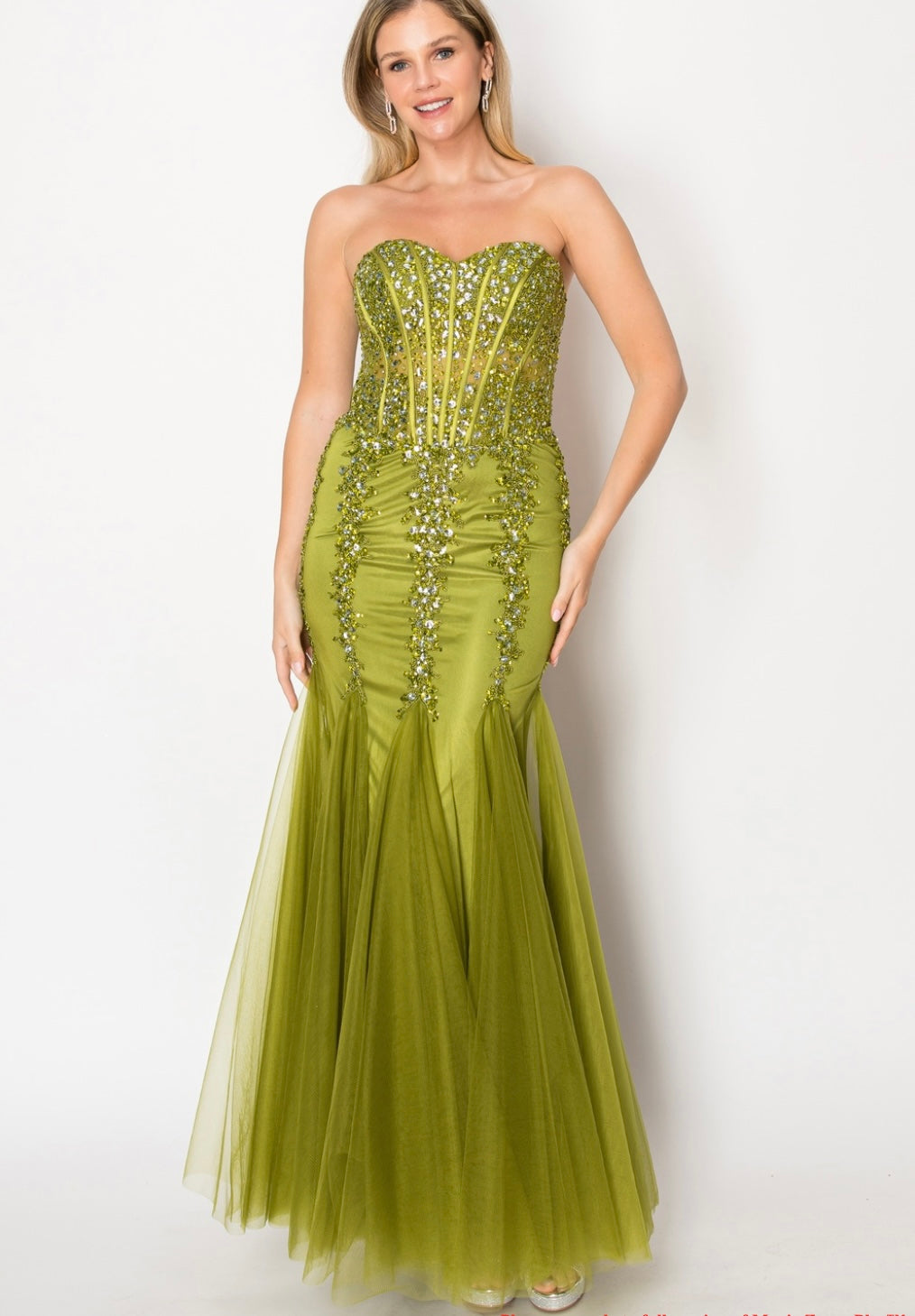 Make a bold and elegant statement with this strapless black evening gown by Chicas, style C820. Featuring a fitted mermaid silhouette, this dress showcases a sheer corset bodice embellished with intricate black beadwork and appliqués that cascade down the skirt. The tulle godets add volume and graceful movement, while the structured bodice enhances the figure for a stunning, sculpted look. Designed by Chicas, this gown is the perfect choice for formal events, galas, or prom nights.