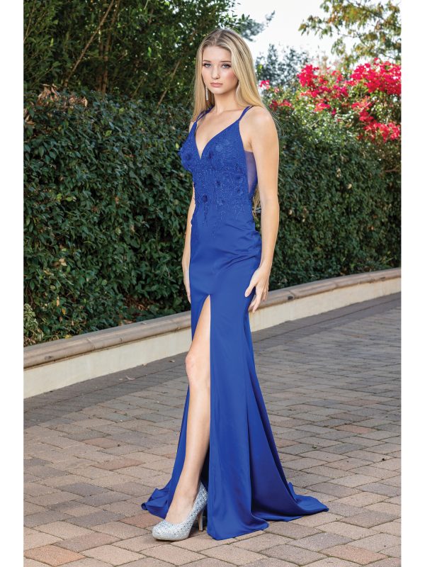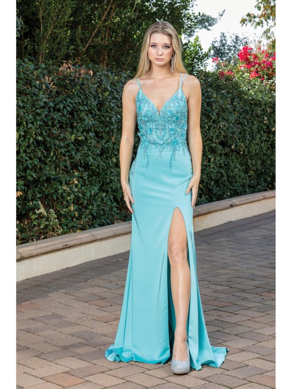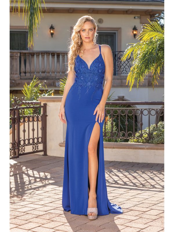 Step into elegance with the Dancing Queen 4319 evening gown, a captivating design that radiates sophistication and charm. This off-the-shoulder dress features a flattering sweetheart neckline and delicate floral appliqués that accentuate the fitted bodice. Crafted from shimmering fabric, the gown hugs your figure beautifully and flows into a floor-length silhouette with a daring thigh-high slit for a modern edge. Ideal for prom, formal events, and red-carpet moments, this gown blends timeless glamour with contemporary appeal.