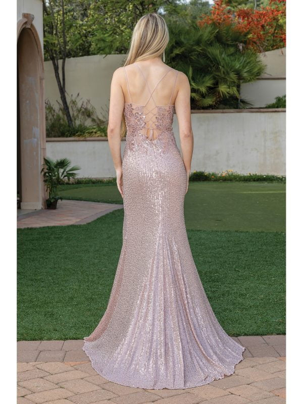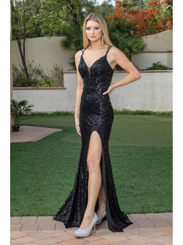 Dancing Queen 4317 is the epitome of timeless elegance and modern glam. This floor-length evening gown features a fitted silhouette with a deep V-neckline and thin spaghetti straps for a sleek, sophisticated look. The bodice is adorned with shimmering sequin embellishments, creating a radiant effect from every angle. A high slit on the skirt adds a bold touch of allure, while the sweeping train enhances its red-carpet appeal. Perfect for proms, galas, and formal events, this gown is available in multiple dazzling colors to suit every style.